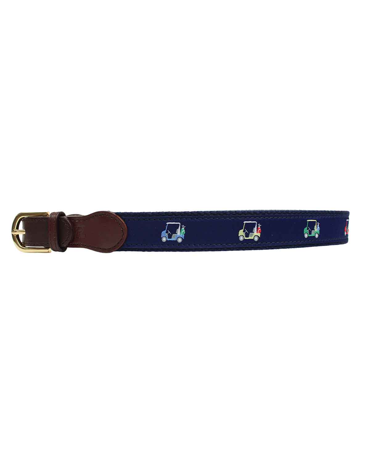 Leather belt ends with a solid brass buckle with cotton webbing around the waist.
