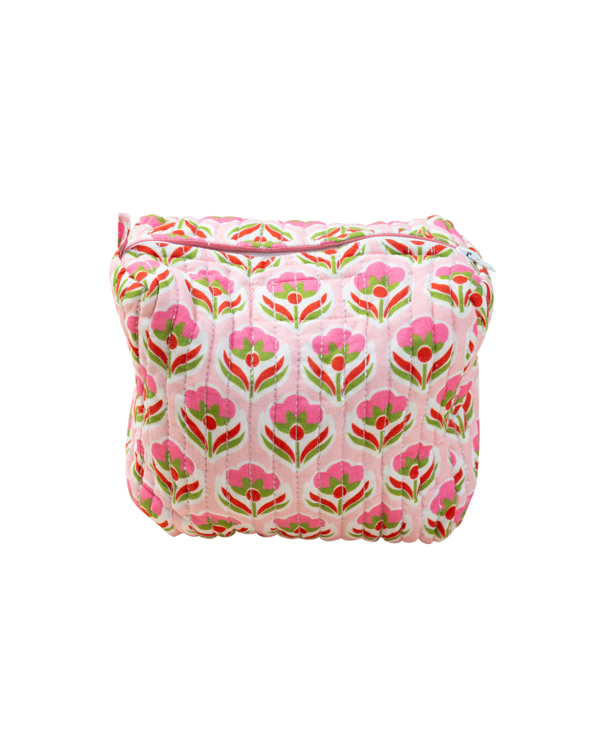 This fun block print zippered pouch is perfect for carrying around your essentials. With a charming blend of tradition and sparkle, this little pouch is perfect to pack all your little items! It's also a great add on to the tote bag to keep all little items secure. Bag measures 5" wide x 6" tall x 3" deep.