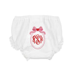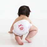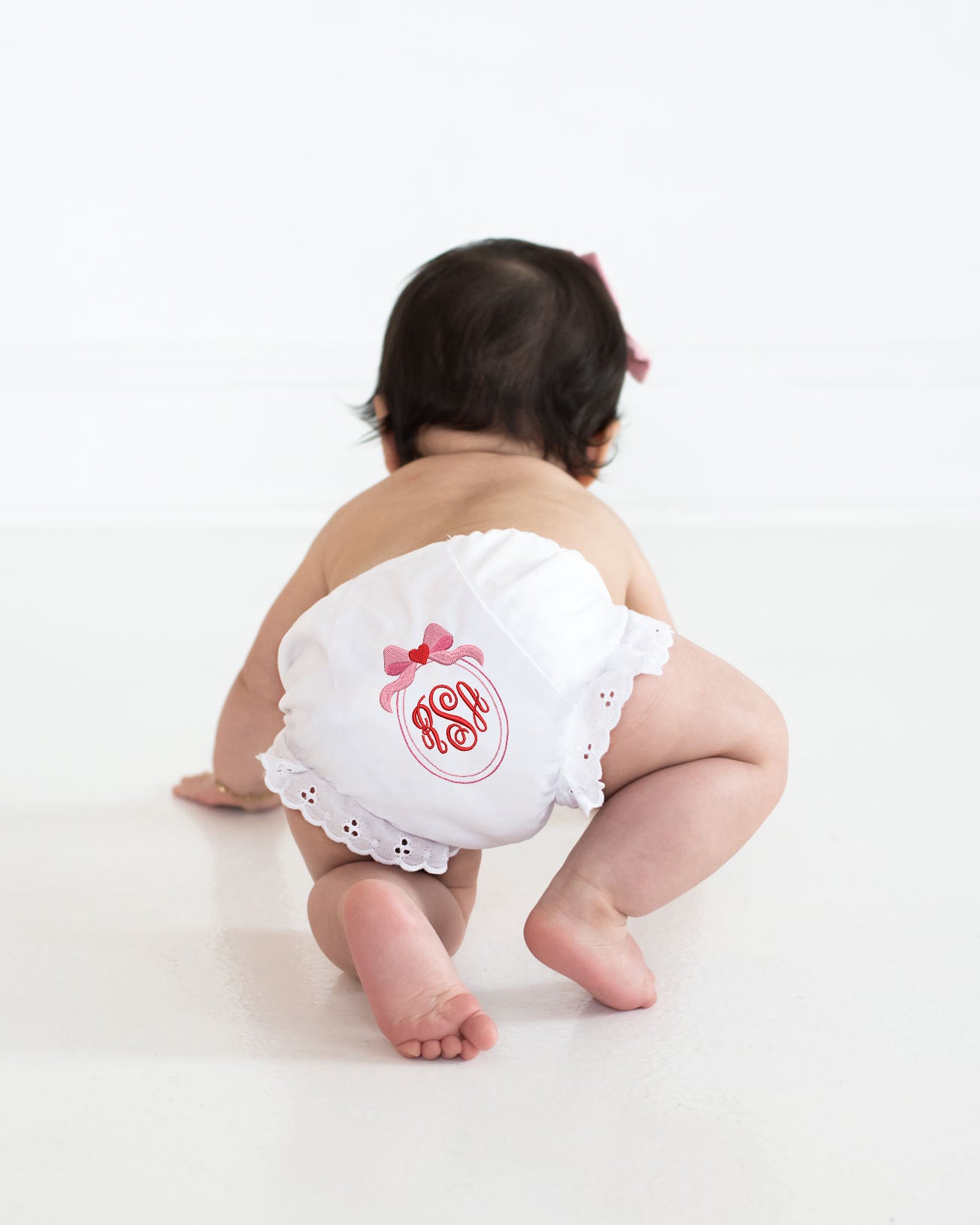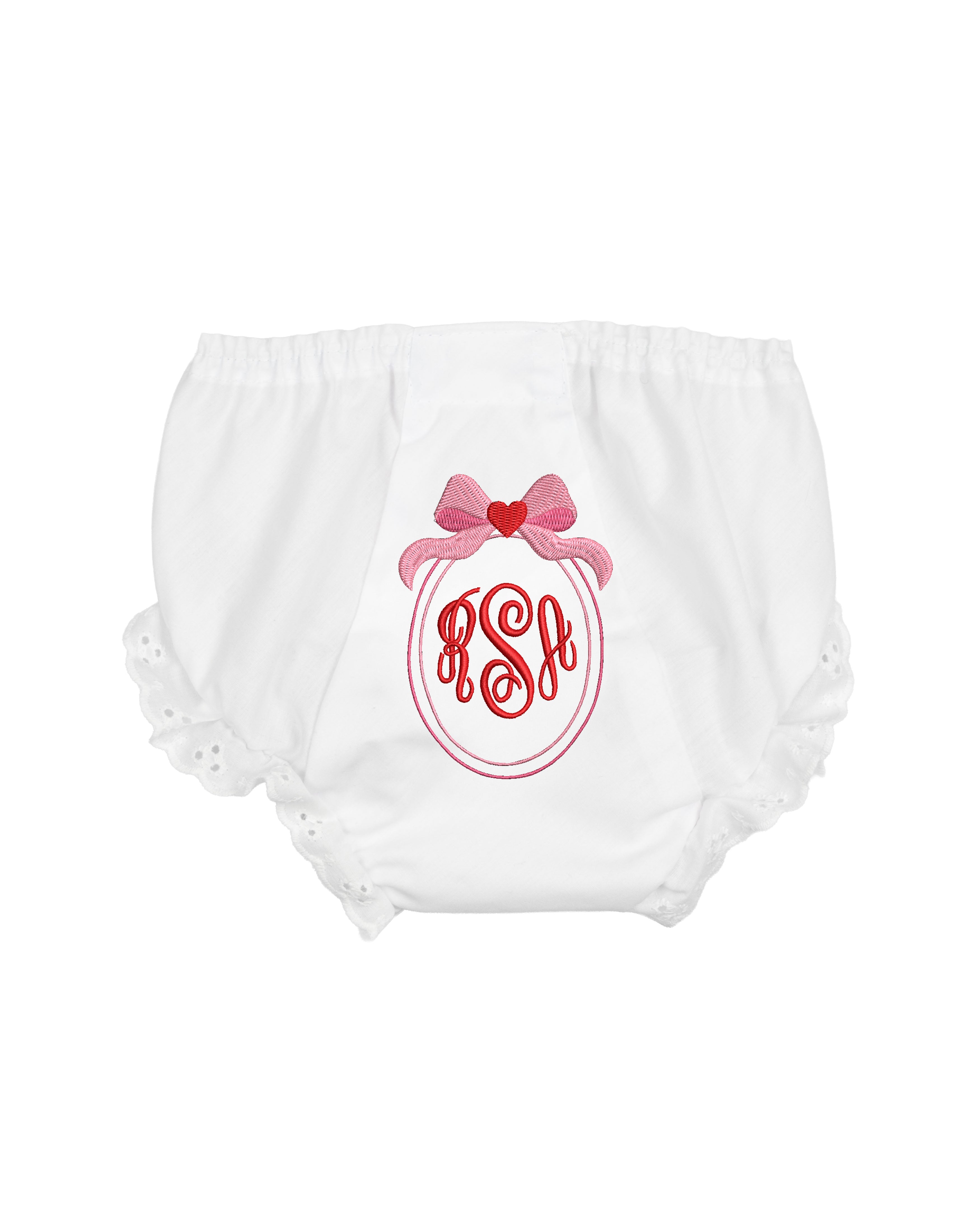 Say hello to the cutest layer ever! These classic white bloomers feature a delicate eyelet trim, topped with a customizable bow and heart monogram. Perfect to be worn under her favorite Valentines dresses, they add a touch of charm to your little girl’s wardrobe.
