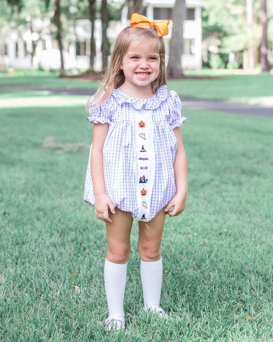 We love this cute and festive outfit for Halloween! Our lavender gingham bubble features charming Halloween embroidery and a ruffle around the neck and sleeves. With metal snaps in the stride, this Halloween bubble is both adorable and practical. Grab this Halloween treat for your little one's wardrobe and make their spooky season extra special!