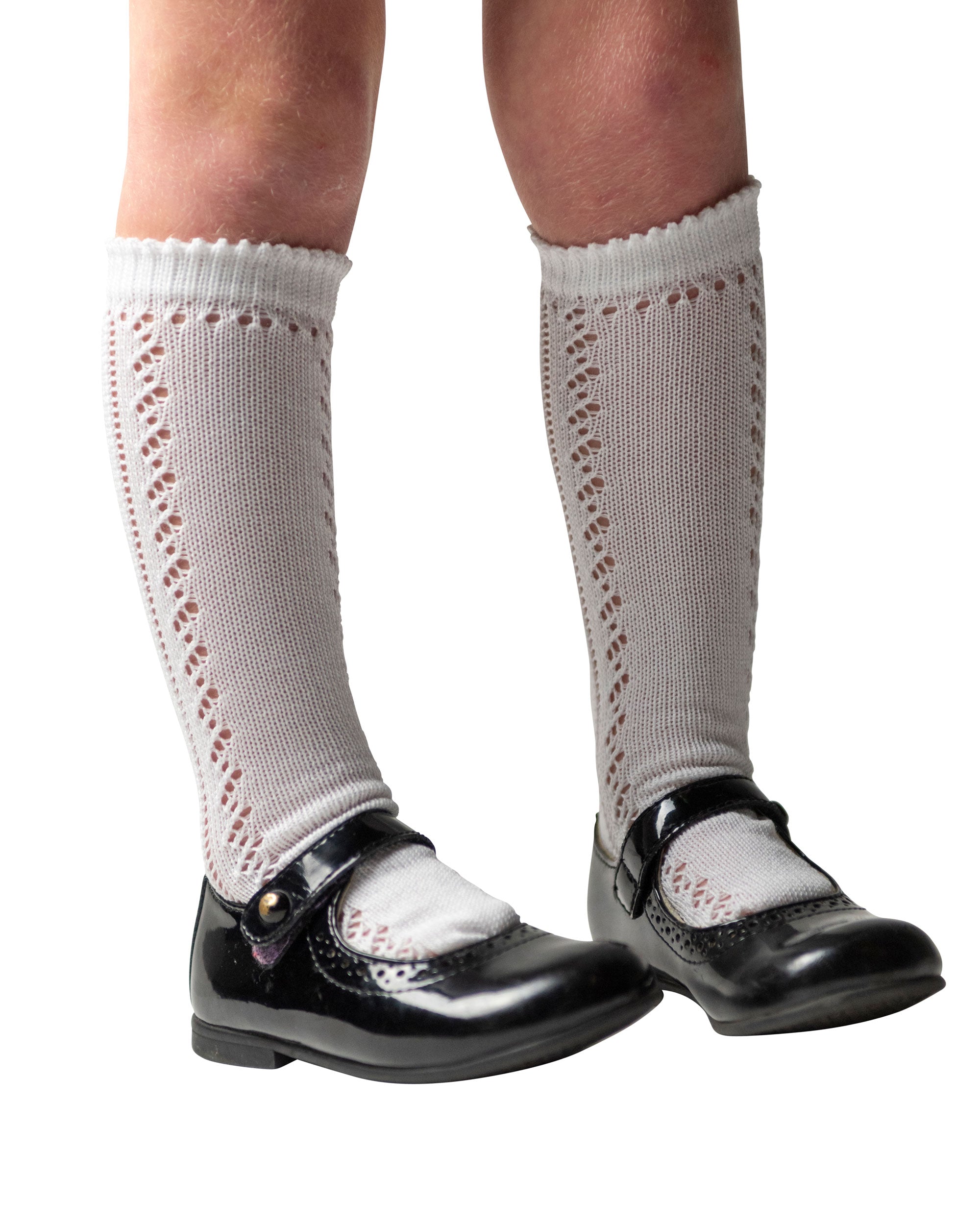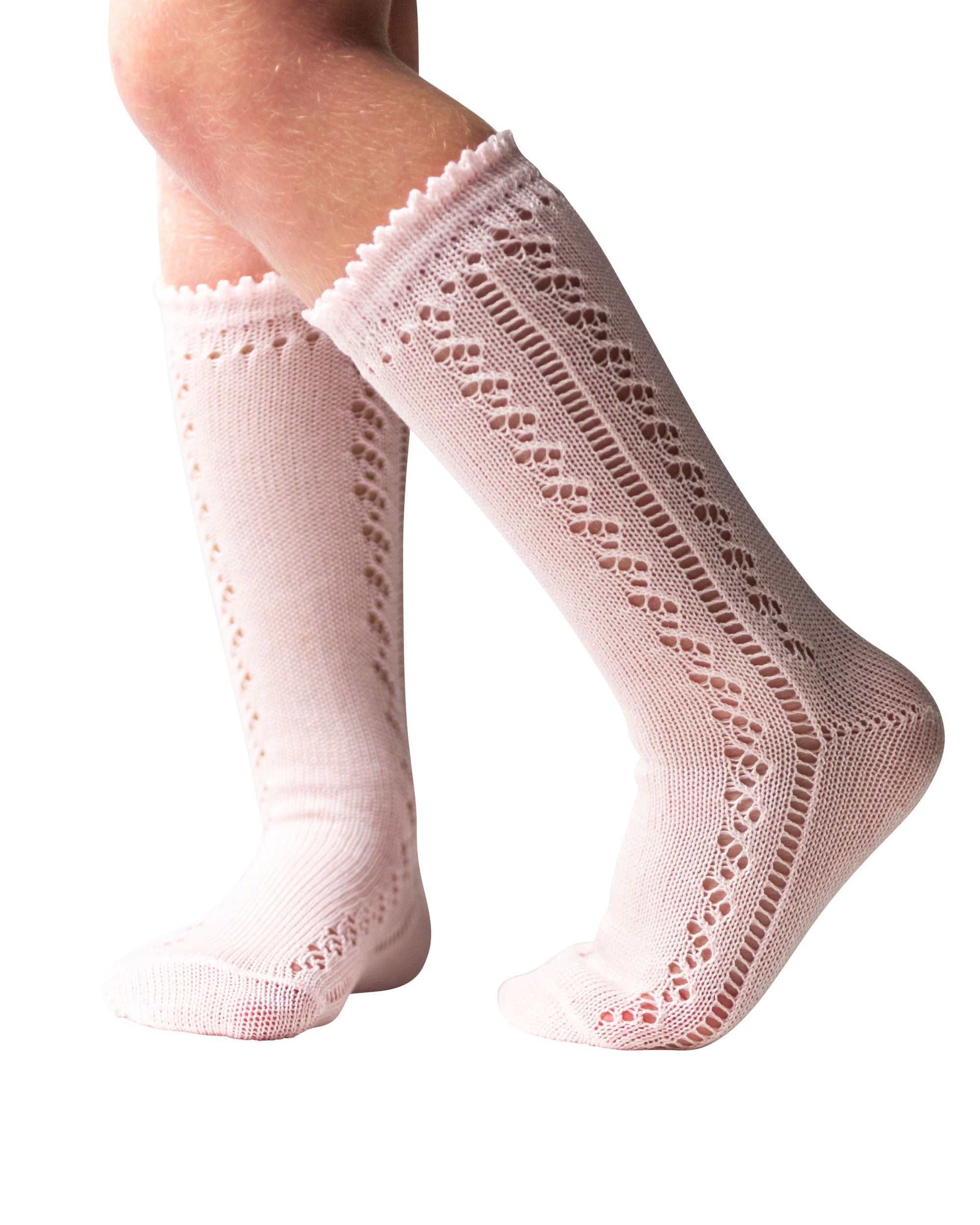 These beautiful open-work socks by Carlomagno are made from Scottish yarn. Offered in white or light pink.