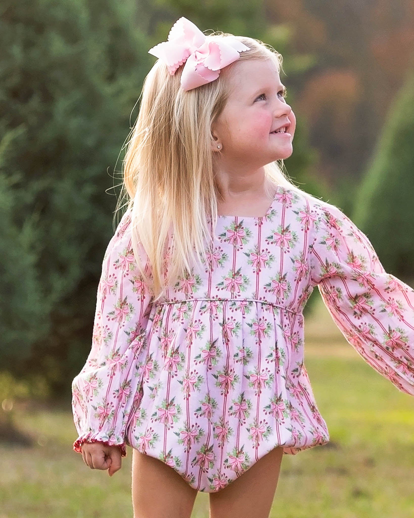 Dress your little one in festive charm with our Holiday Bow Striped Bubble! Featuring a beautiful Christmas wreath print, this adorable one-piece is designed for both style and comfort. Long sleeves and ruffle leg openings add a sweet vintage touch, while the easy snap closures ensure fuss-free changes. A perfect holiday outfit for making treasured memories!