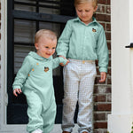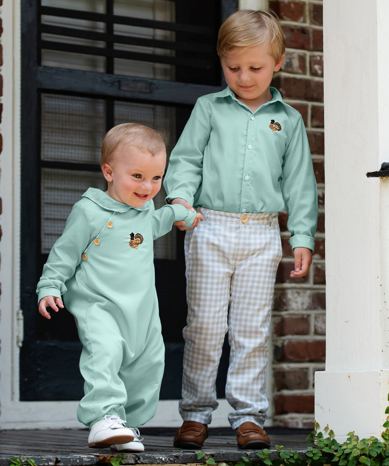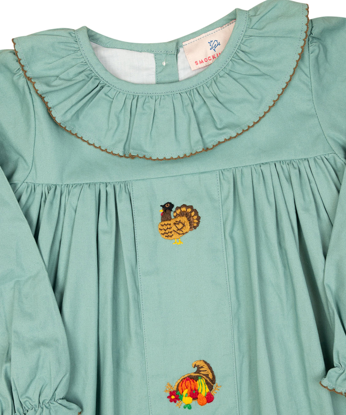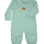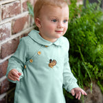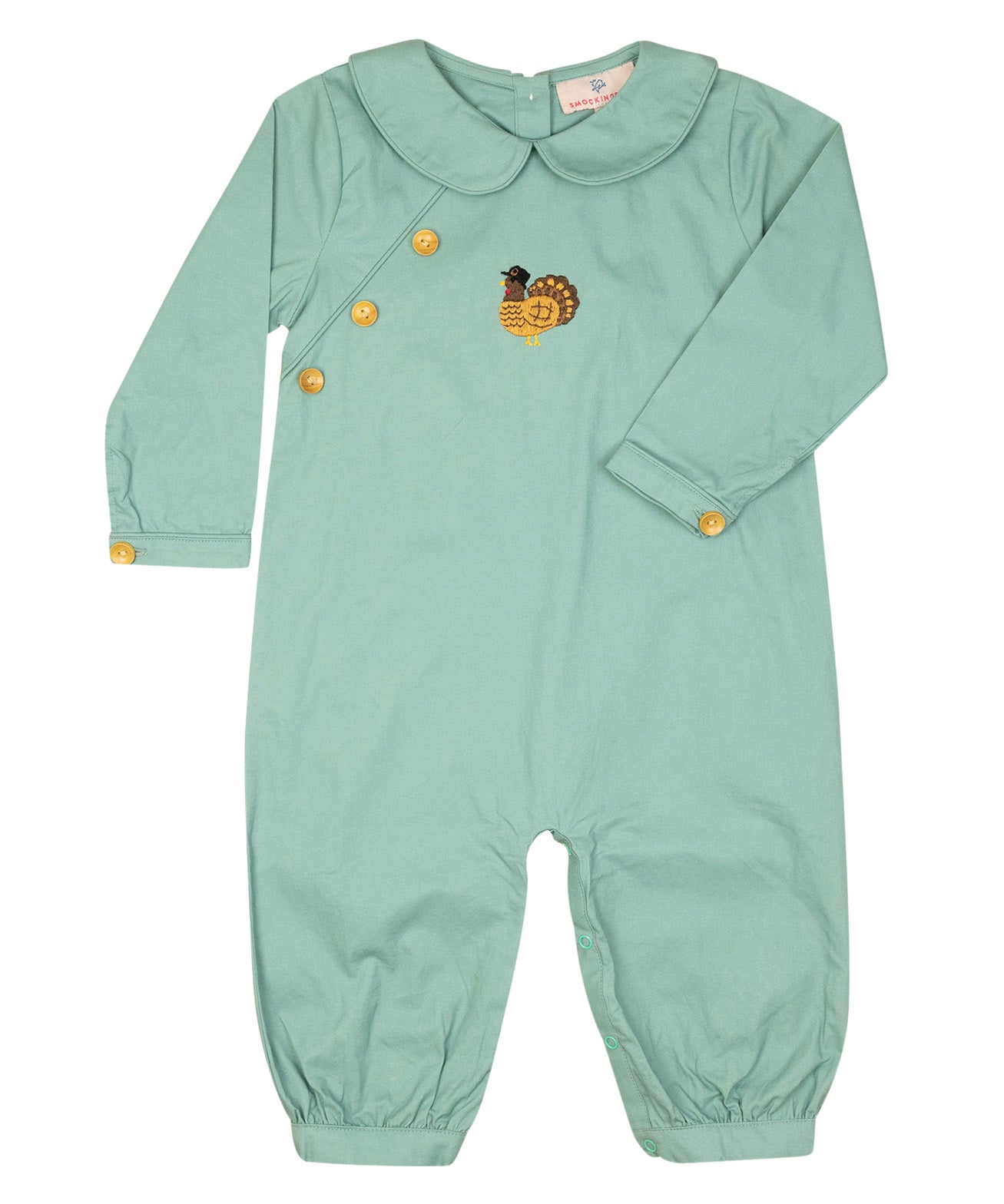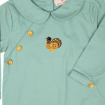 Sage green longall with small wooden buttons at the end of sleeve. Adorable Hand embroidered turkey on the center of the chest. Metal snaps in stride and made fully lined—perfect addition for a little boy running around this Thanksgiving. Add a monogram straight across chest or name in vintage cursive on collar.