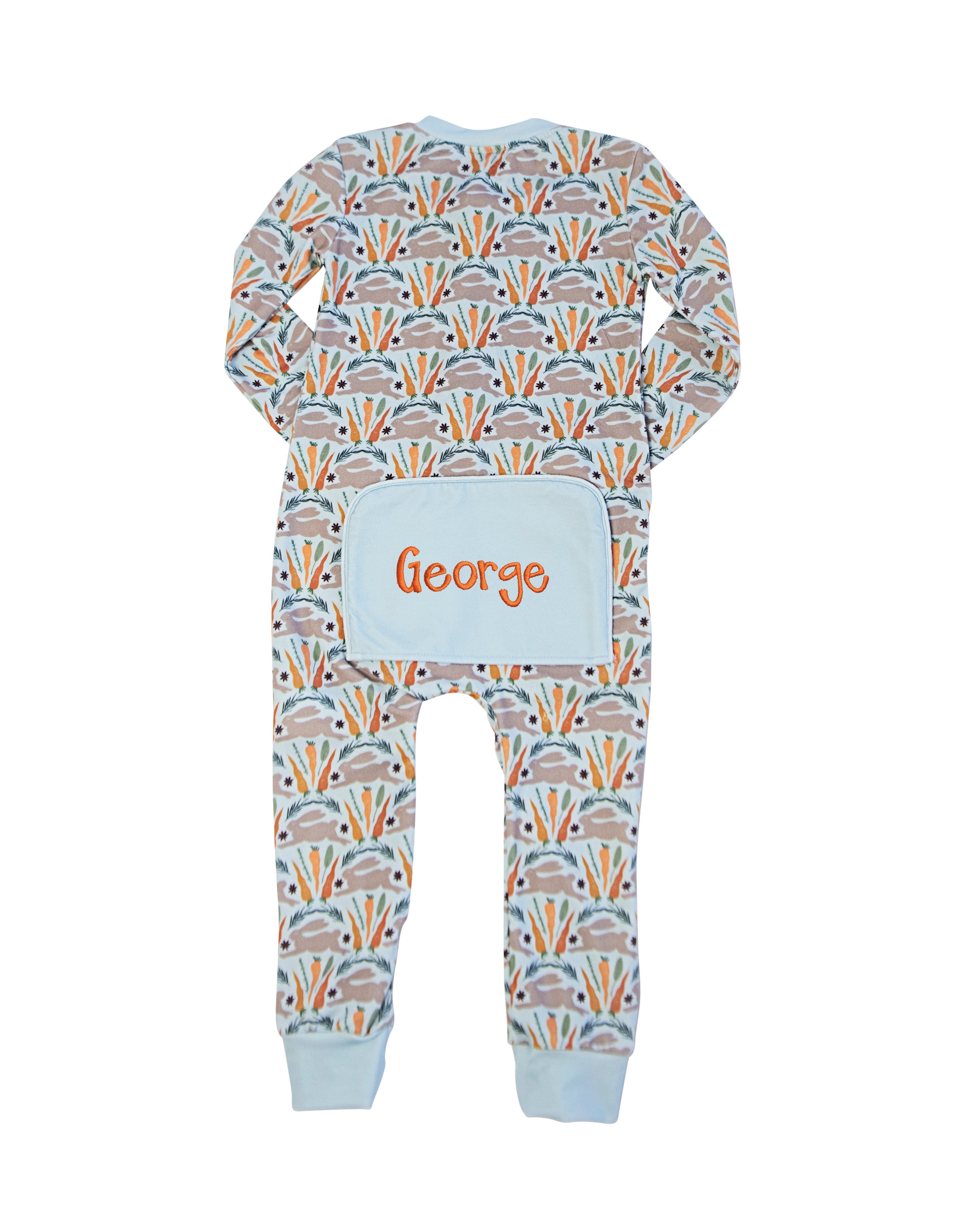 Our adorable carrot and bunny pima cotton zip-up is perfect for Easter. This super soft pajama is a favorite for Spring! Monogram shown in happy font with orange thread.