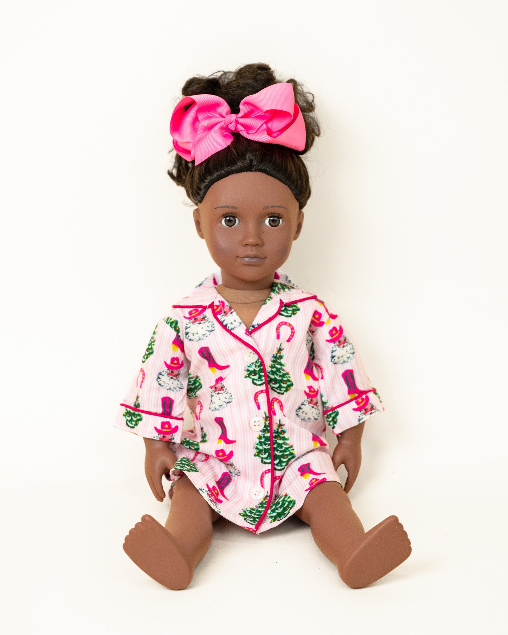 The Cowboy Christmas Doll Gown is the perfect holiday accessory for doll lovers. Featuring the same festive cowboy print as the kids’ pajamas, this gown completes the matching look. A wonderful gift for little ones who love to include their dolls in holiday traditions. Fits an 18 inch tall doll.
