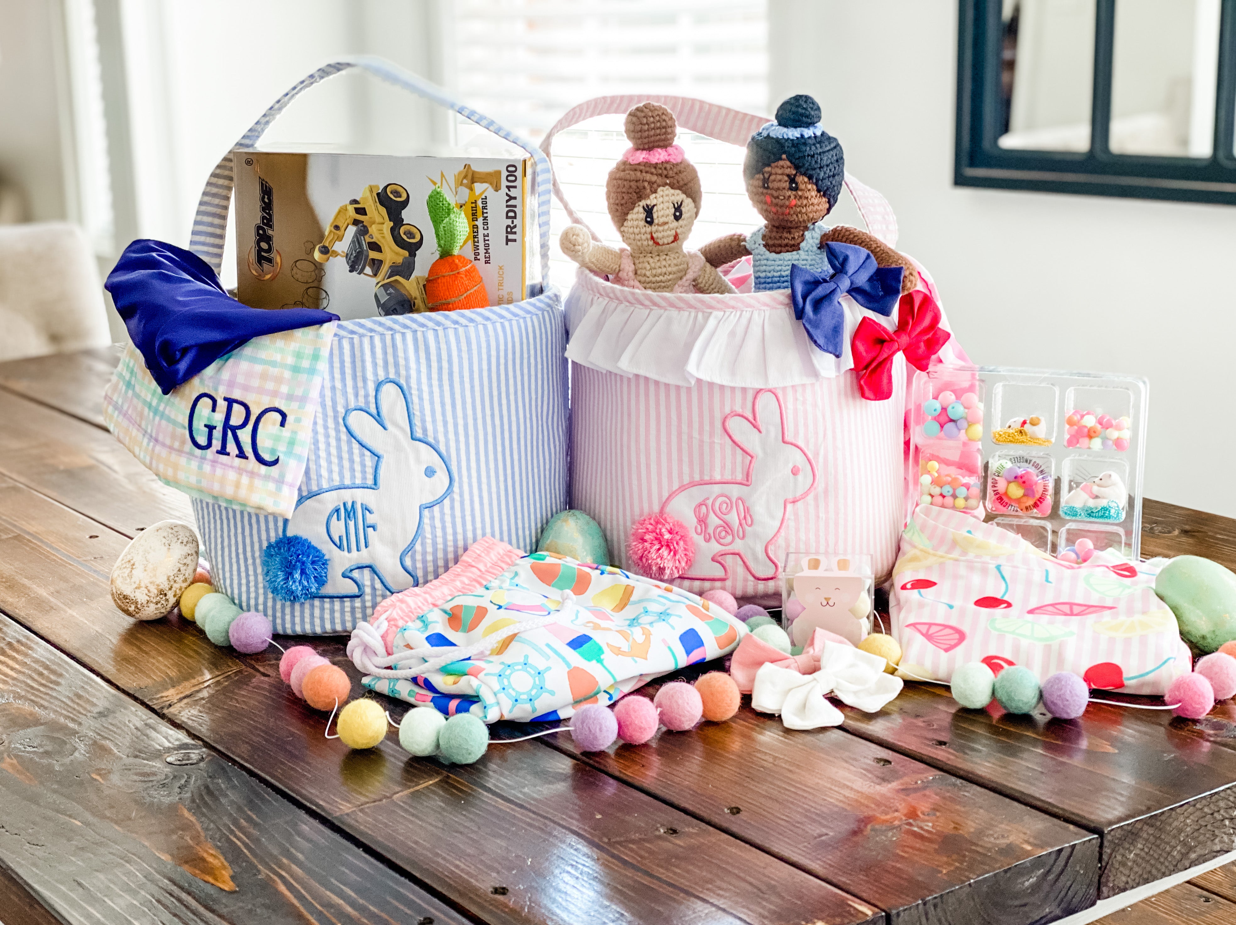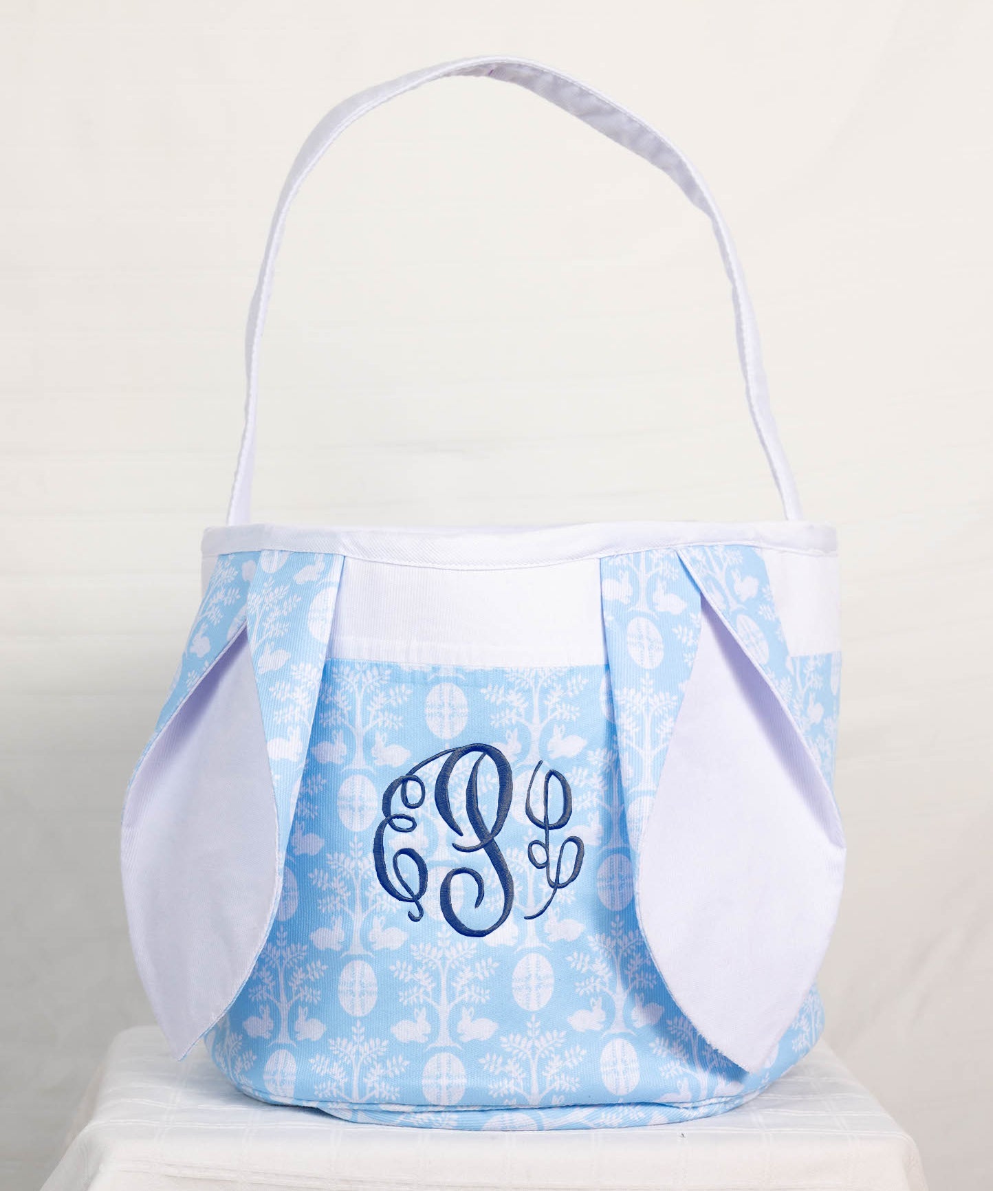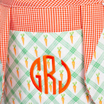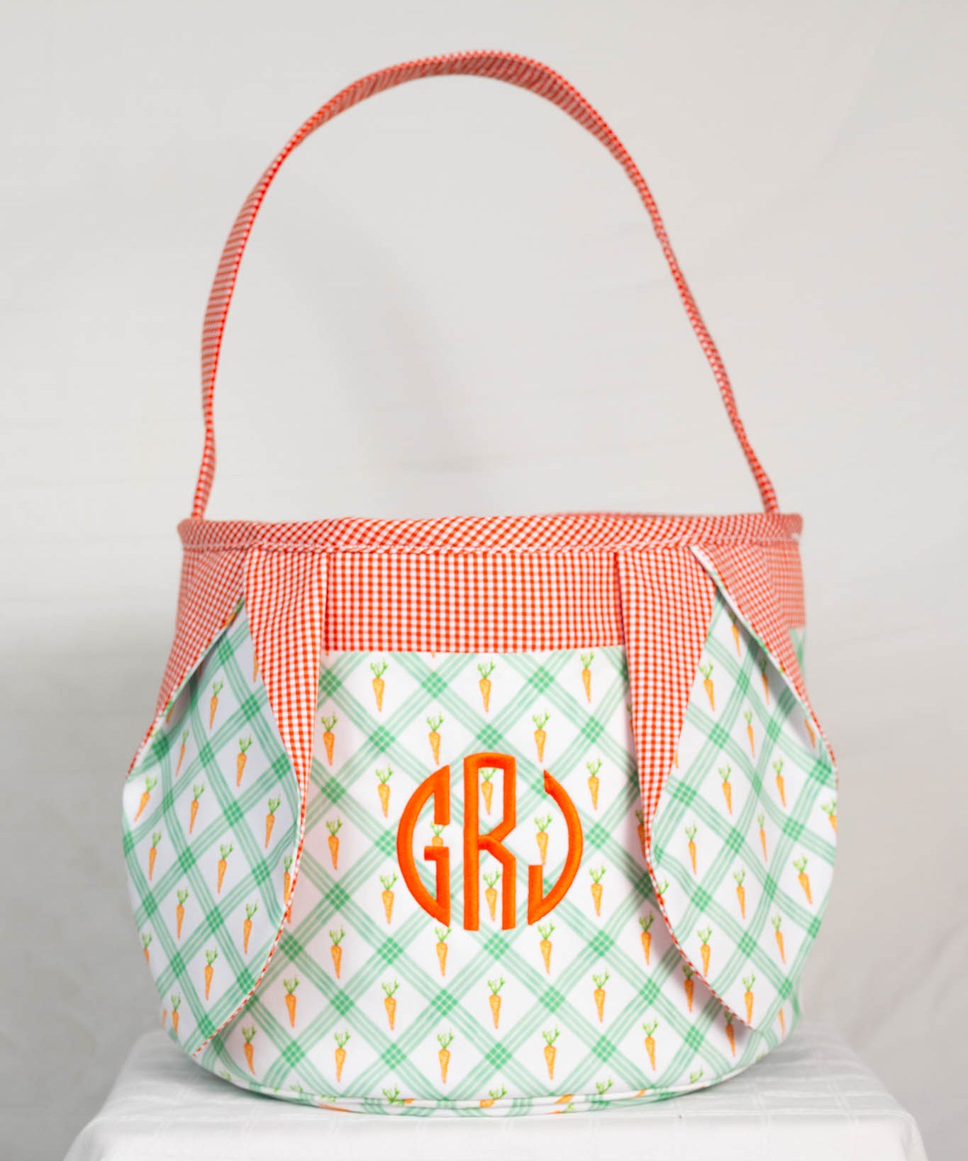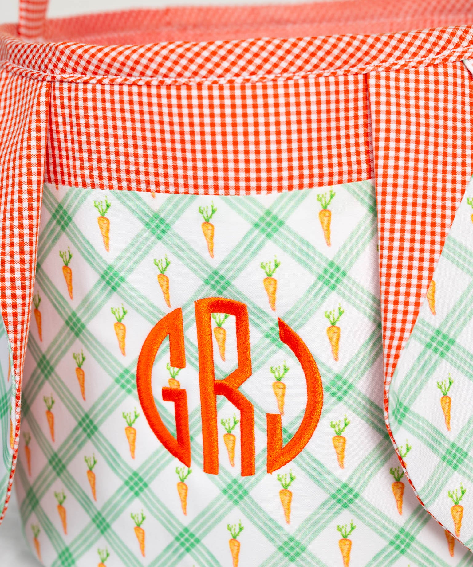 Hunt for Easter eggs in style with this adorable orange and green carrot plaid print Easter Basket. Basket features bunny ears and a white pom pom tail in the back. Add a monogram in orange thread for a personal touch.