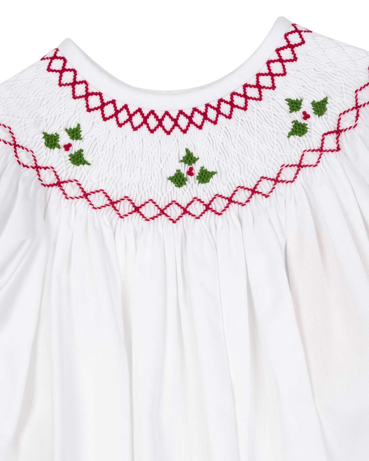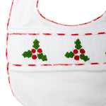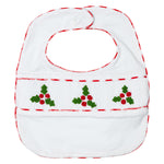 White bib trimmed in red gingham with smocked Christmas holly berries. A sweet bib for baby's first Christmas. Adjustable snaps.