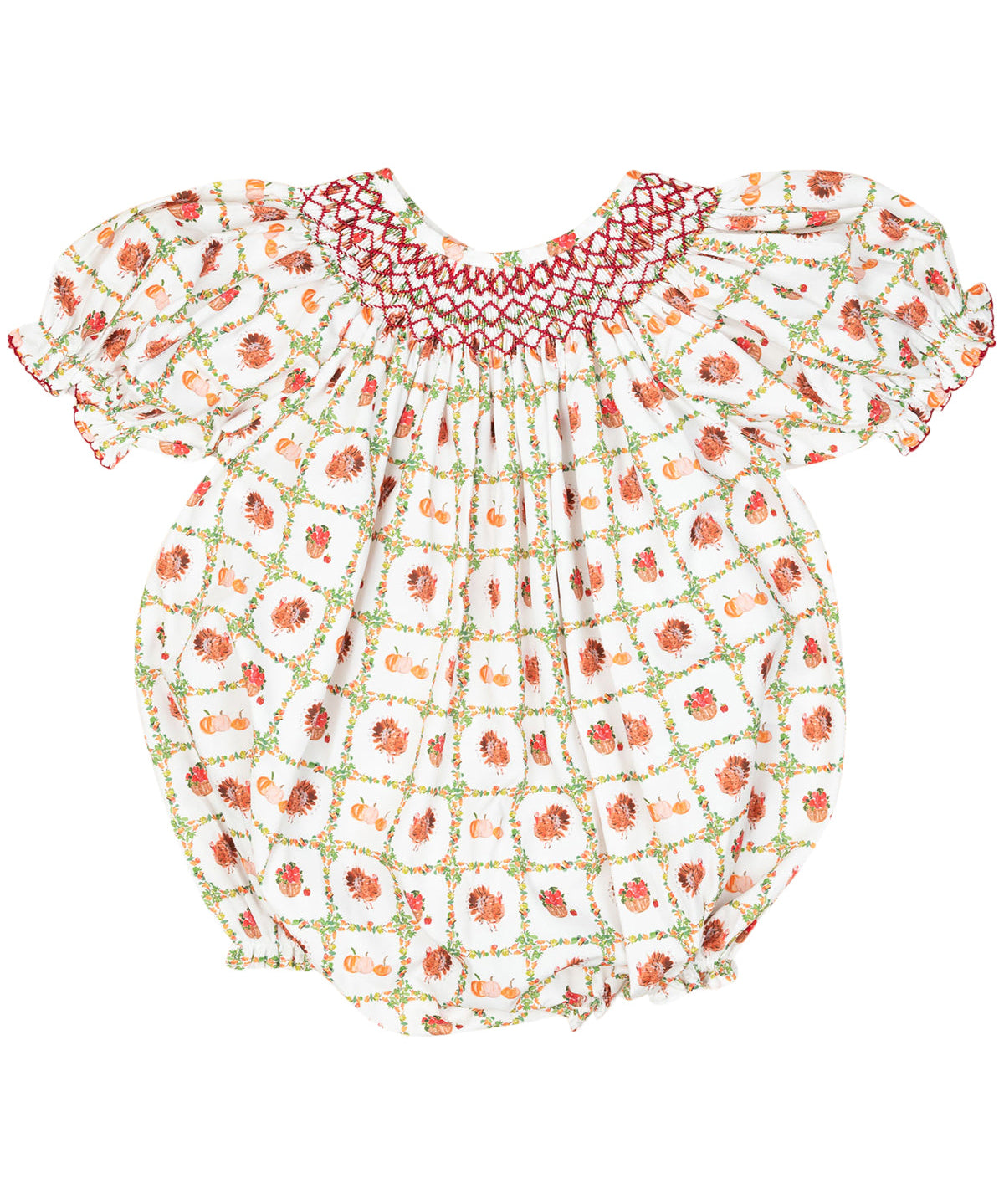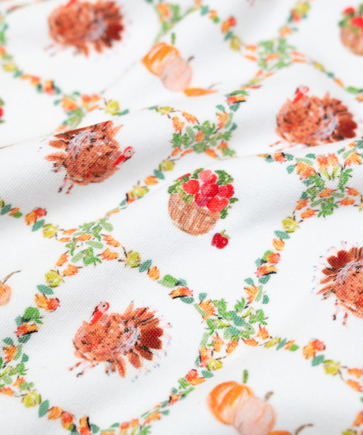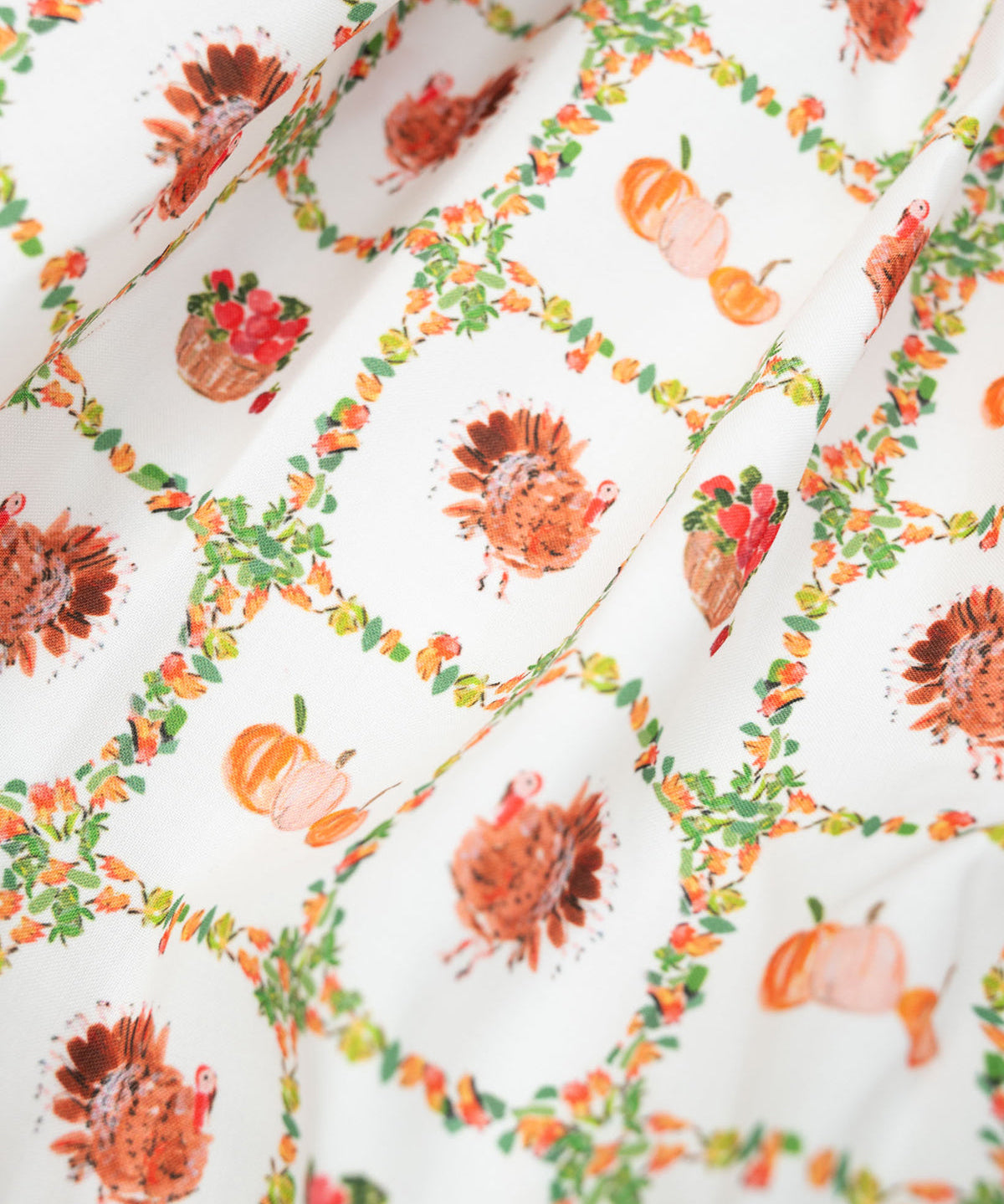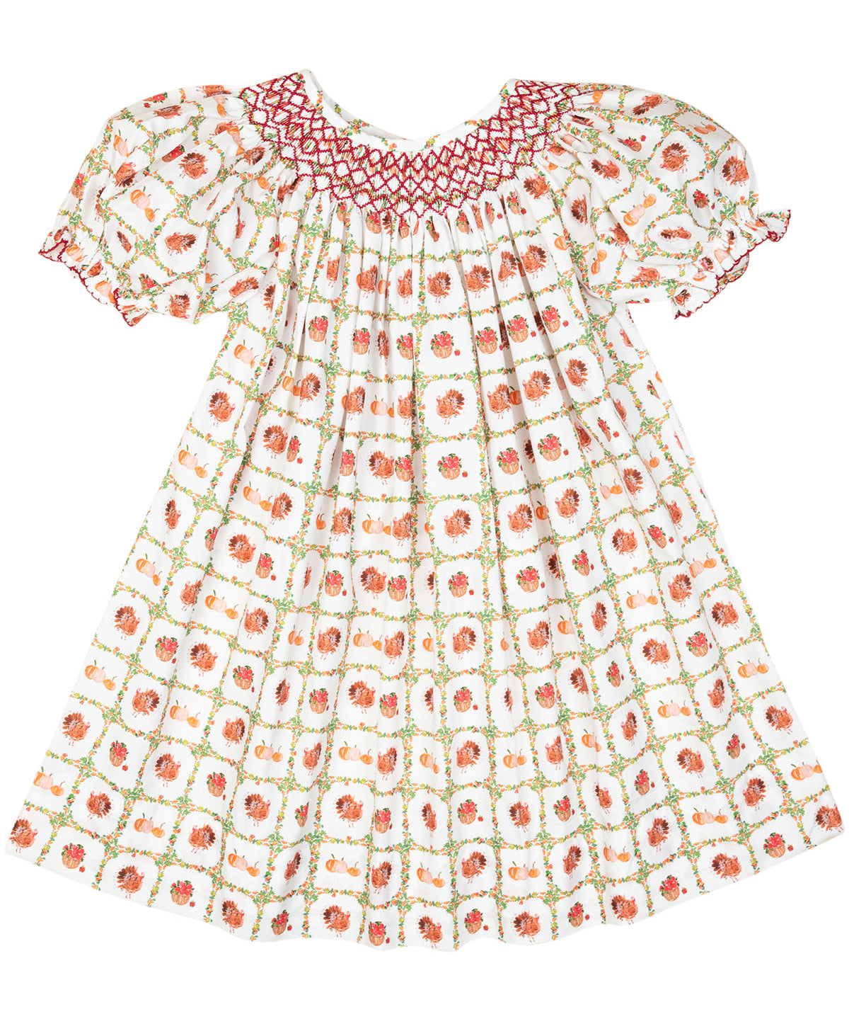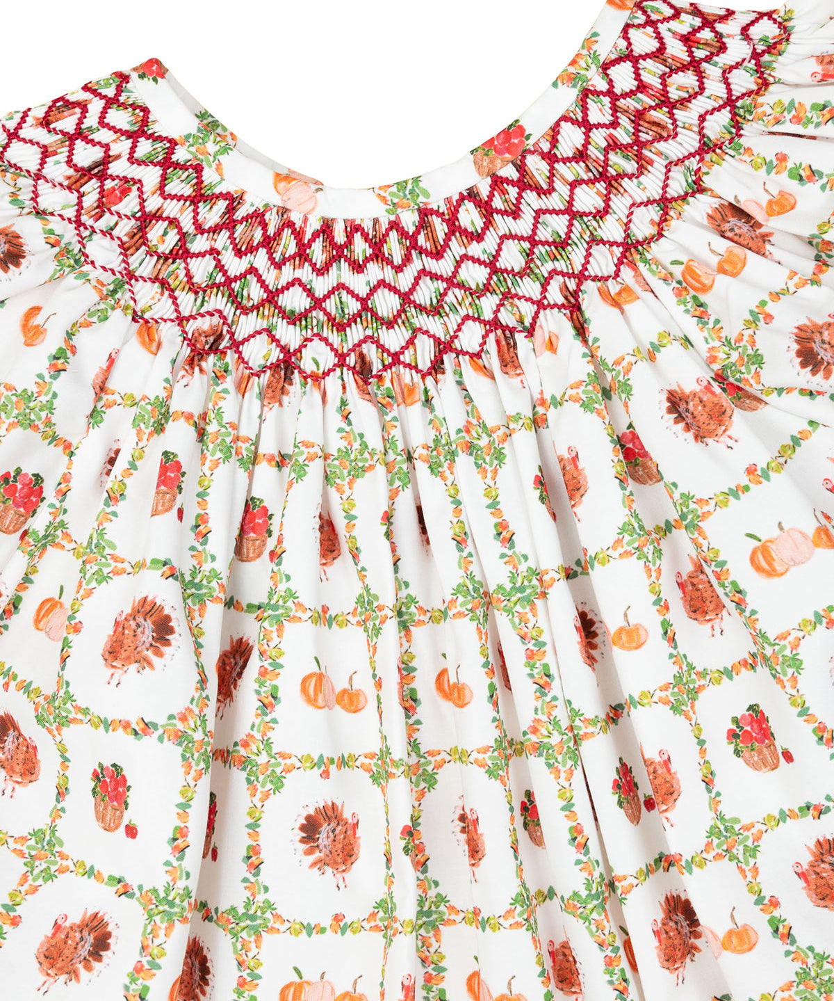 A festive favorite for Thanksgiving gatherings! The Turkey Time Tartan Dress features a charming grid print adorned with adorable turkeys, complemented by a smocked neckline and delicate embroidery. With its classic puff sleeves and flowy silhouette, this dress is perfect for twirling through autumn festivities.