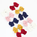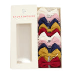 10 hair bows packaged in an adorable little box.  Box includes 2 white, 2 pink, 2 navy, 2 marigold and 2 red hair bows.  Bows are 2 inches and secures with an alligator clip.