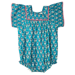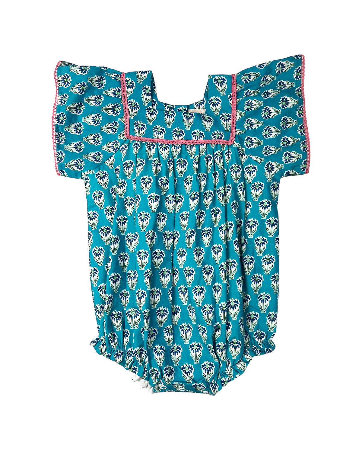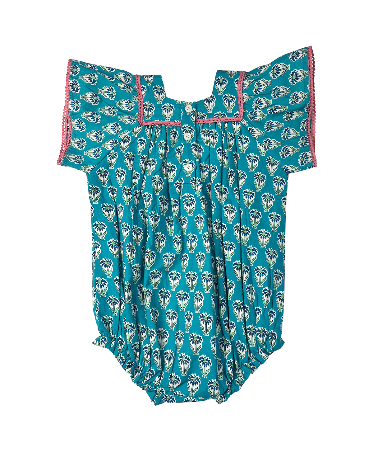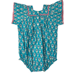 This charming cotton bubble showcases a bold blue daisy block print. With a precious square neckline lined in pink picot lace trim. Designed for comfort and easy wear, it’s ideal for everyday outings. The floral pattern adds gentle beauty. A classic addition to any collection.
