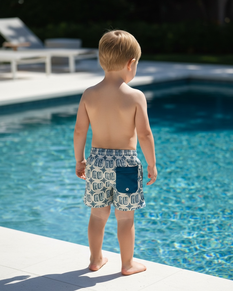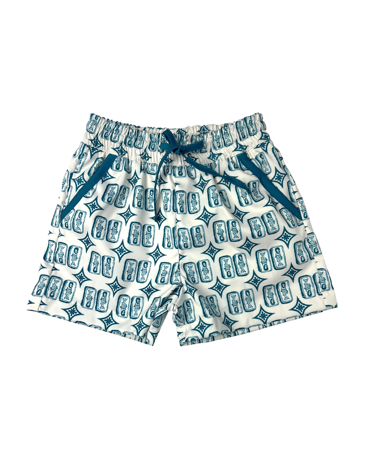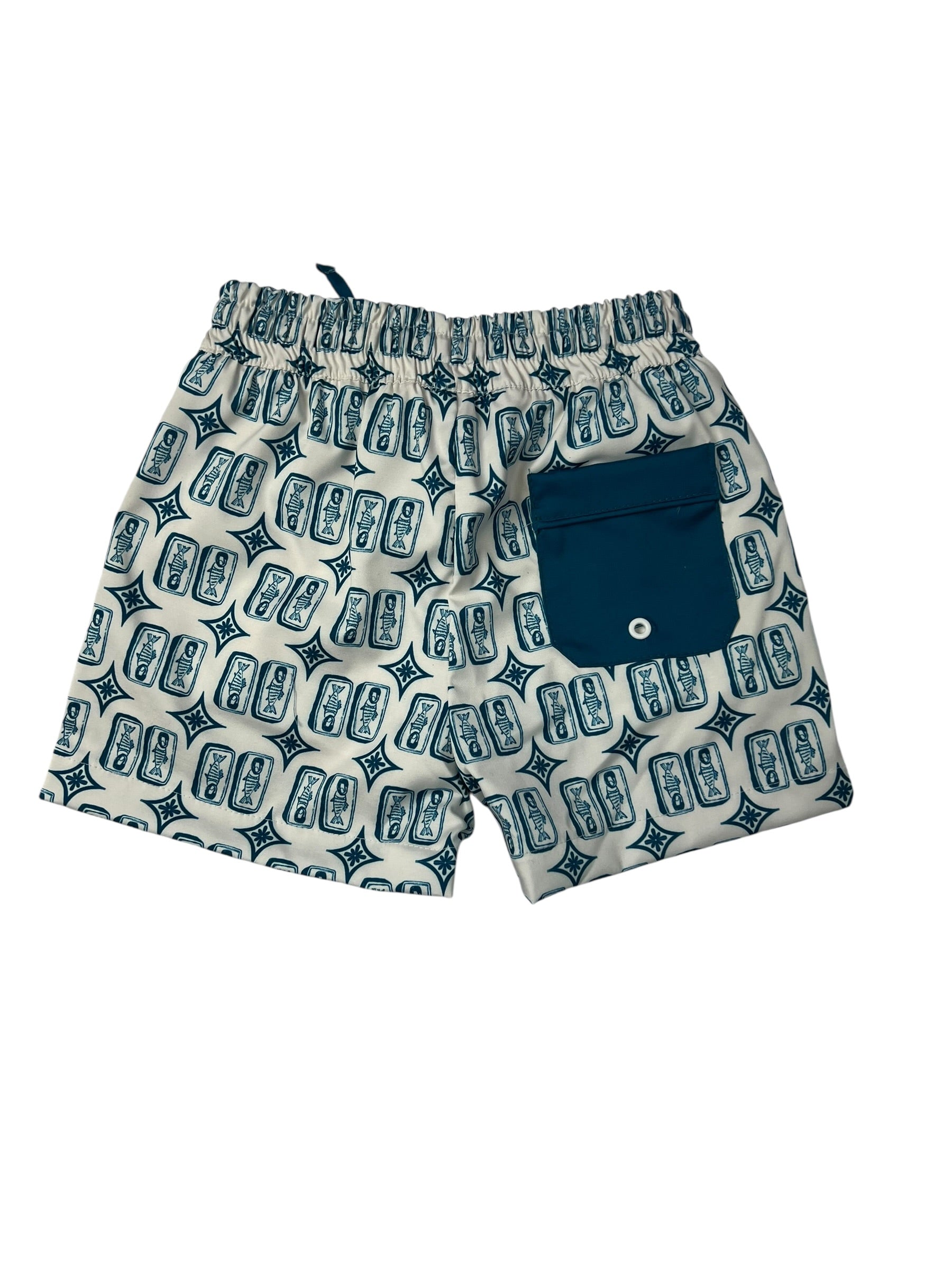 These classic swim trunks showcase a timeless sardine tin print. Perfect for seaside days and poolside play, they offer both comfort and style. The crisp design brings nostalgic charm. A must-have for summer fun.