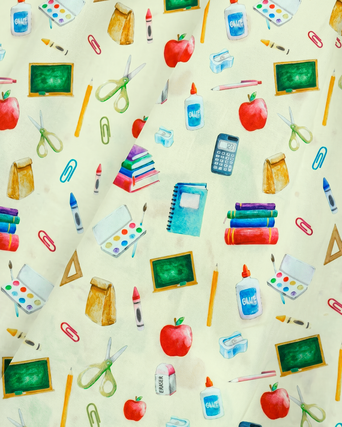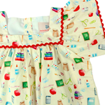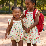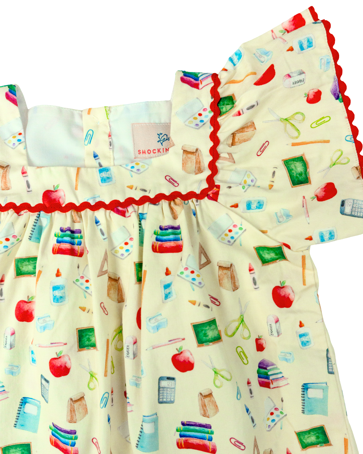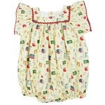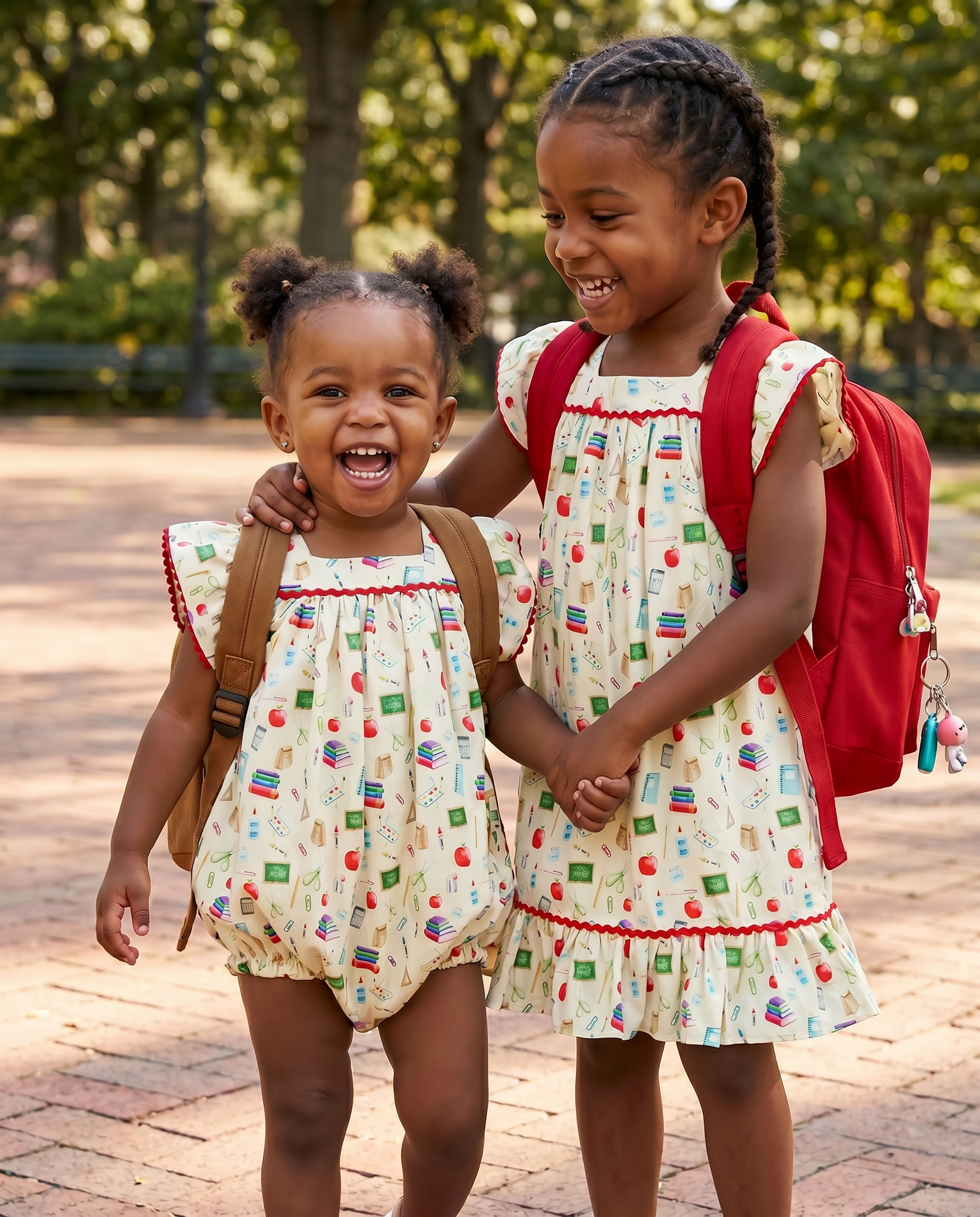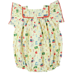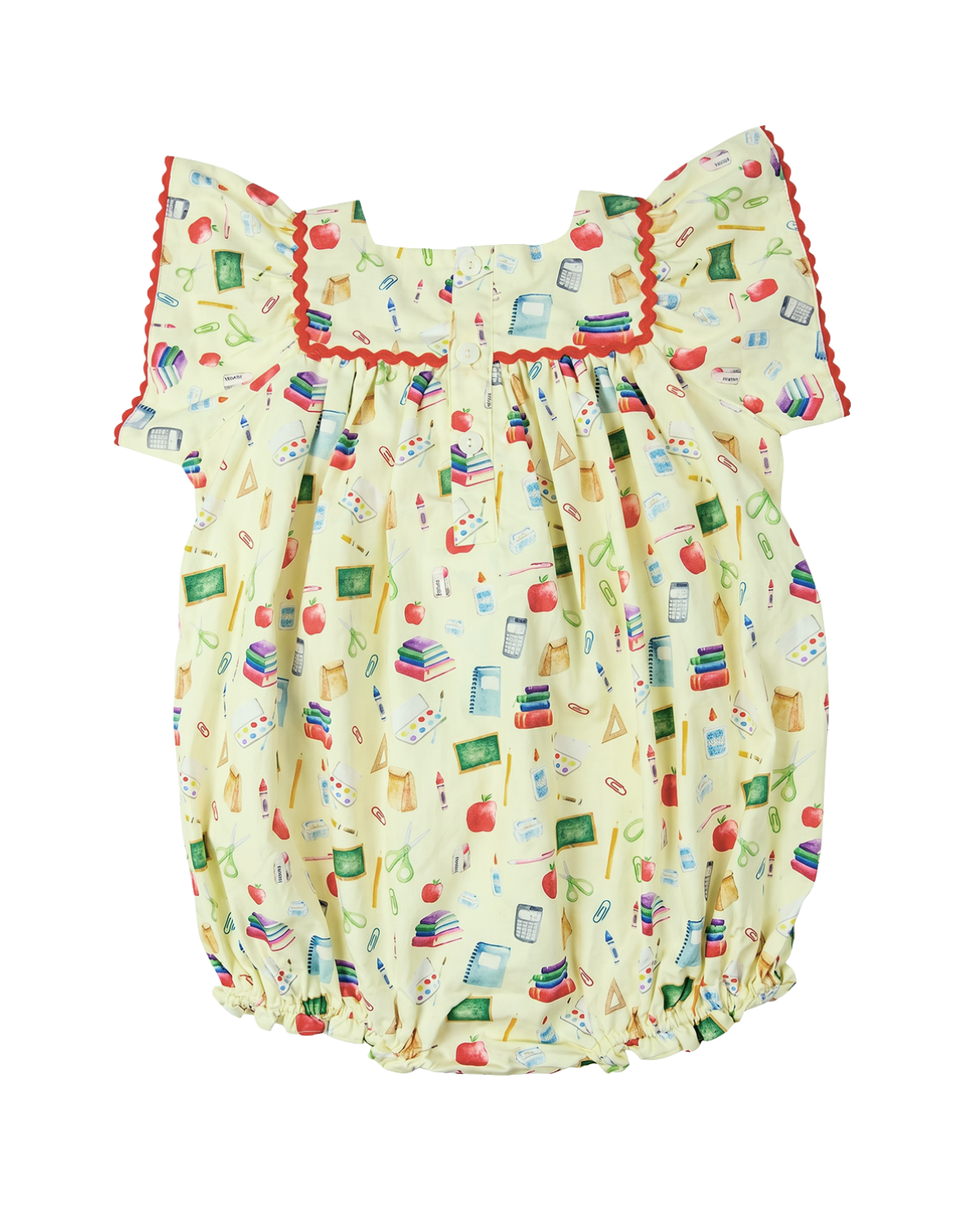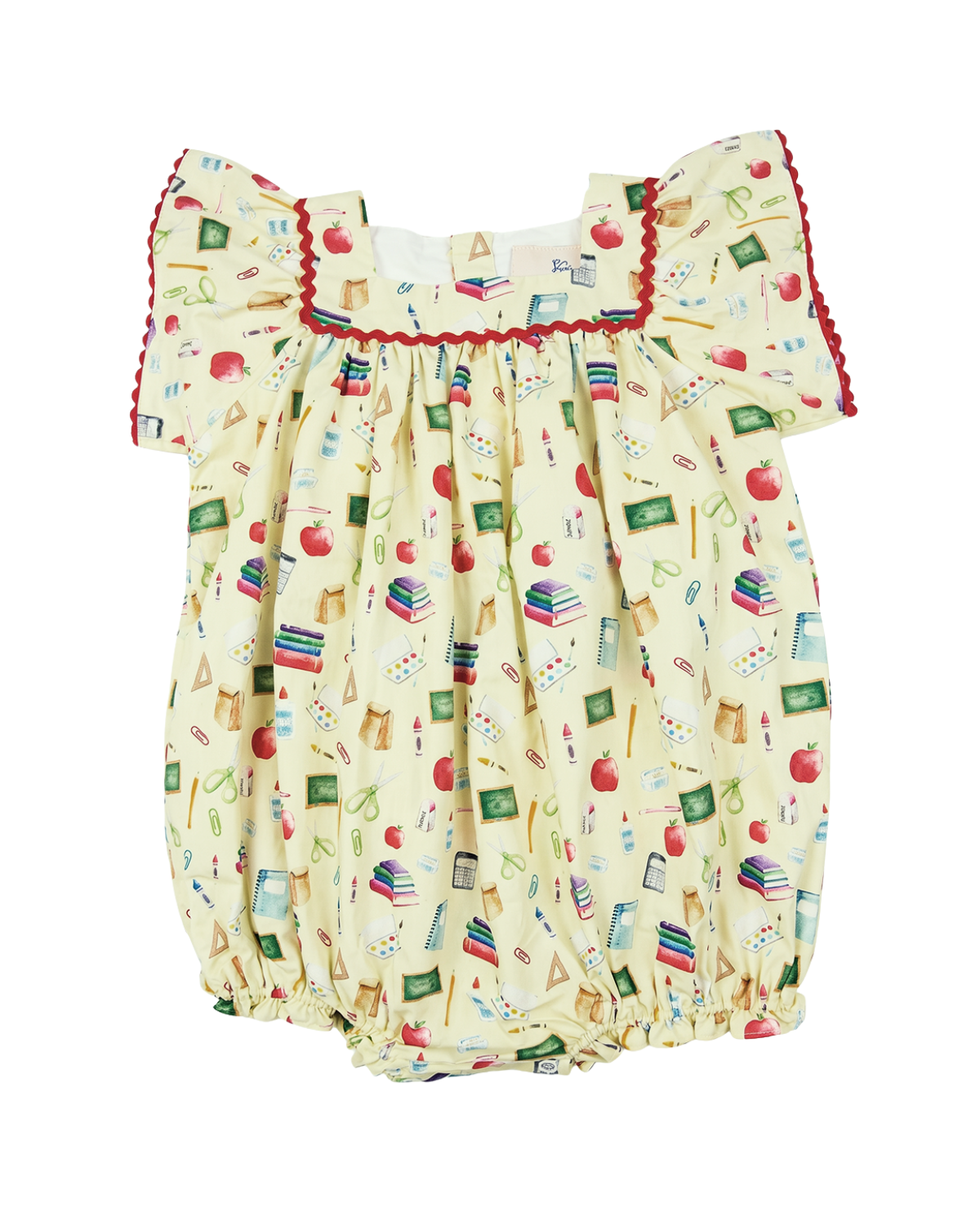 This darling bubble features a coordinating classroom print with flutter sleeves and soft gathering. Elastic leg openings and bottom snaps offer comfort and convenience. Designed for easy movement throughout the day. A perfect back-to-school outfit for everyday wear and photos.