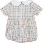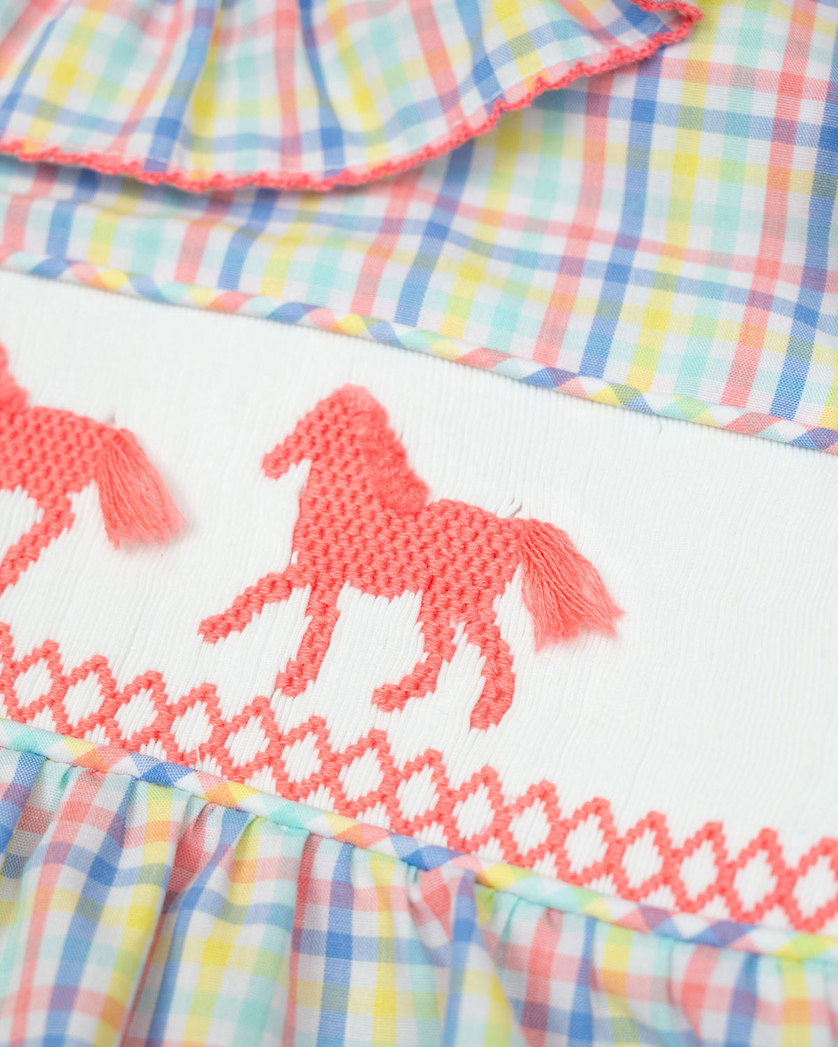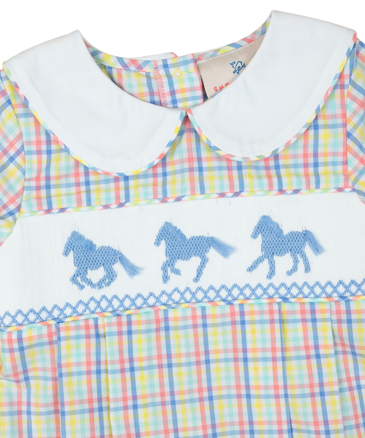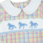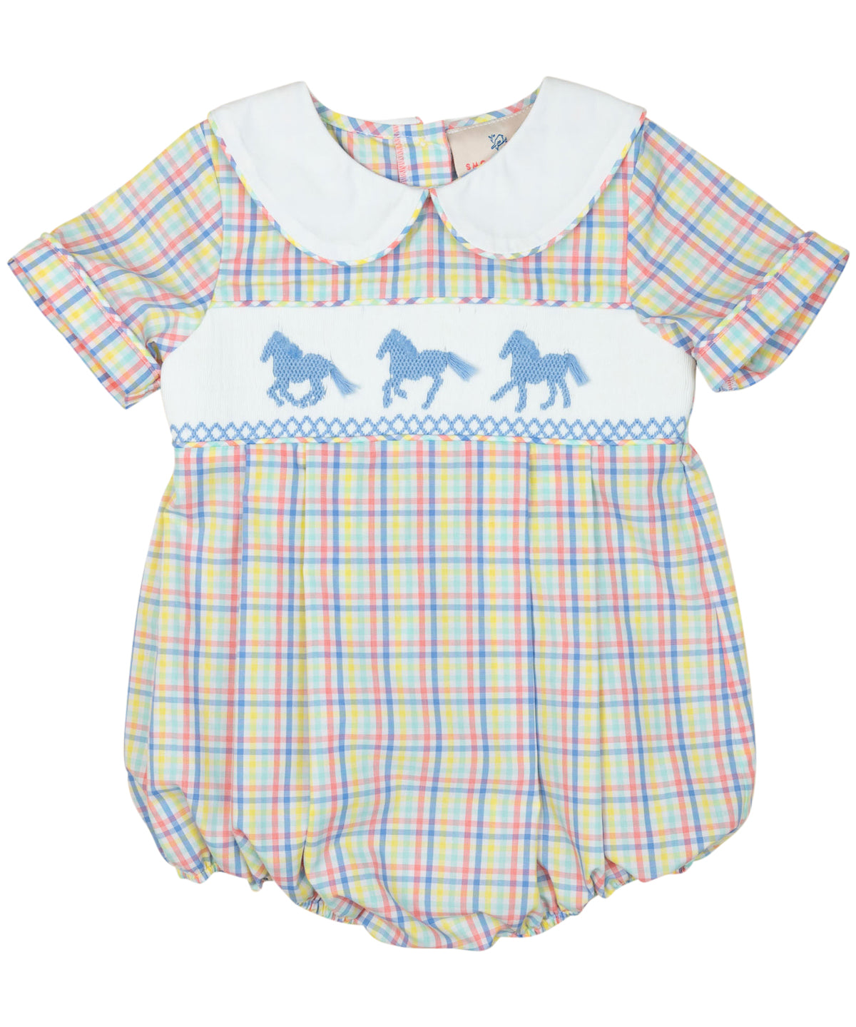 Keep it classic with our Ready to Run Smocked Boy Bubble, featuring a tailored design and a charming horse-themed smocked panel. The pastel plaid fabric pairs beautifully with a crisp Peter Pan collar and snap closures for easy dressing. A perfect match with the Ready to Run Smocked Dress, this piece is ideal for coordinating sibling outfits and photo-worthy moments.
