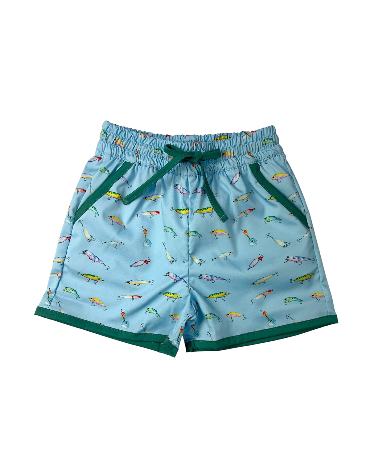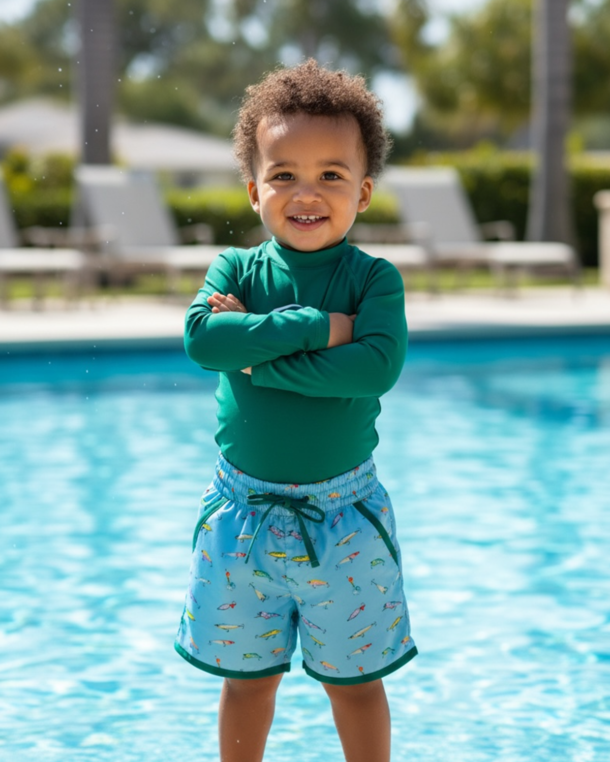 These swim trunks feature a playful fishing-inspired print for fun days by the water. Designed for comfort and easy movement, they’re perfect for pool and beach adventures. The cheerful design adds personality. A summer essential for active little ones.