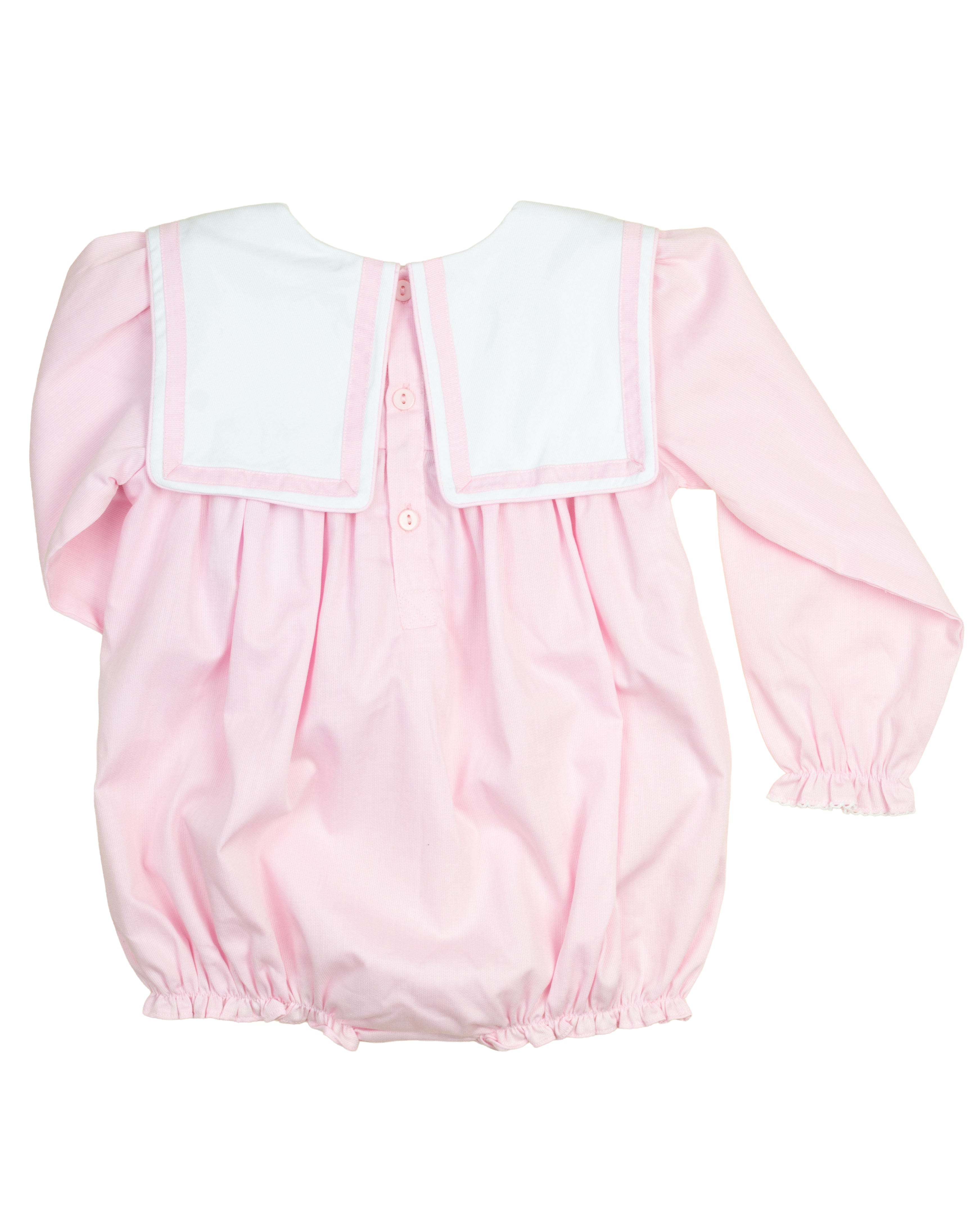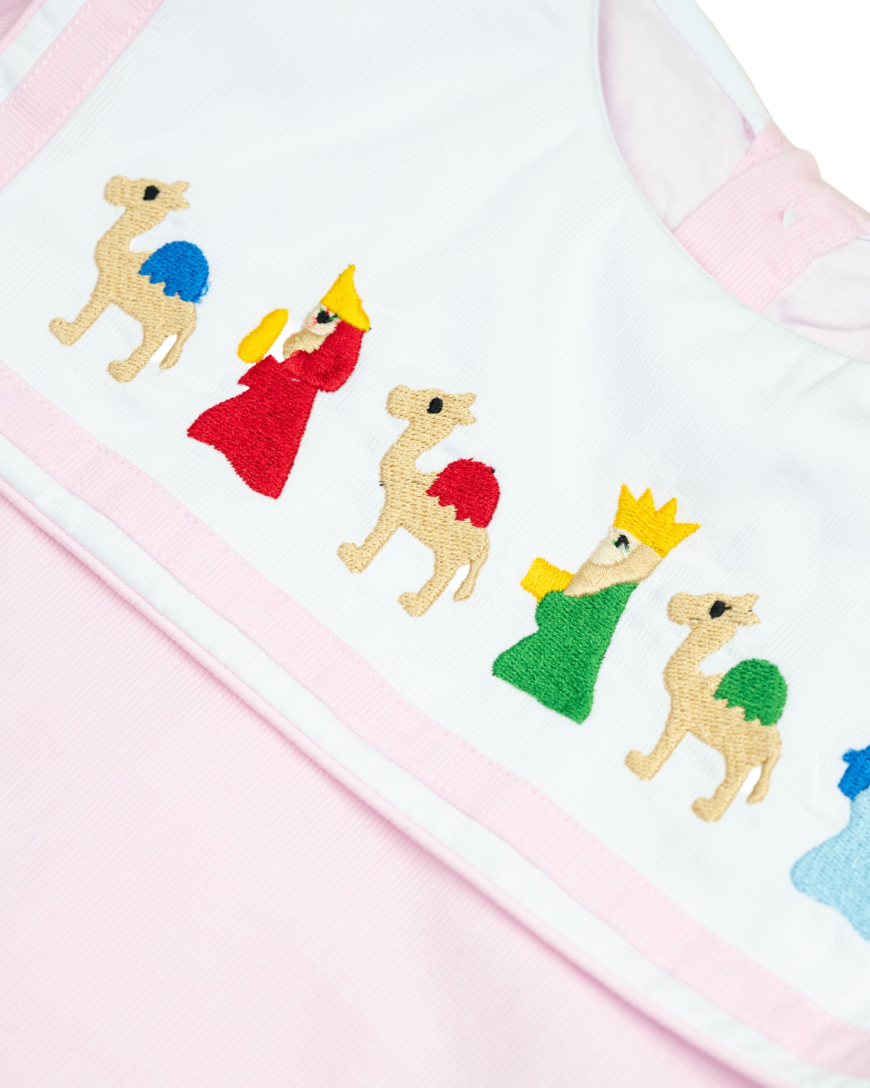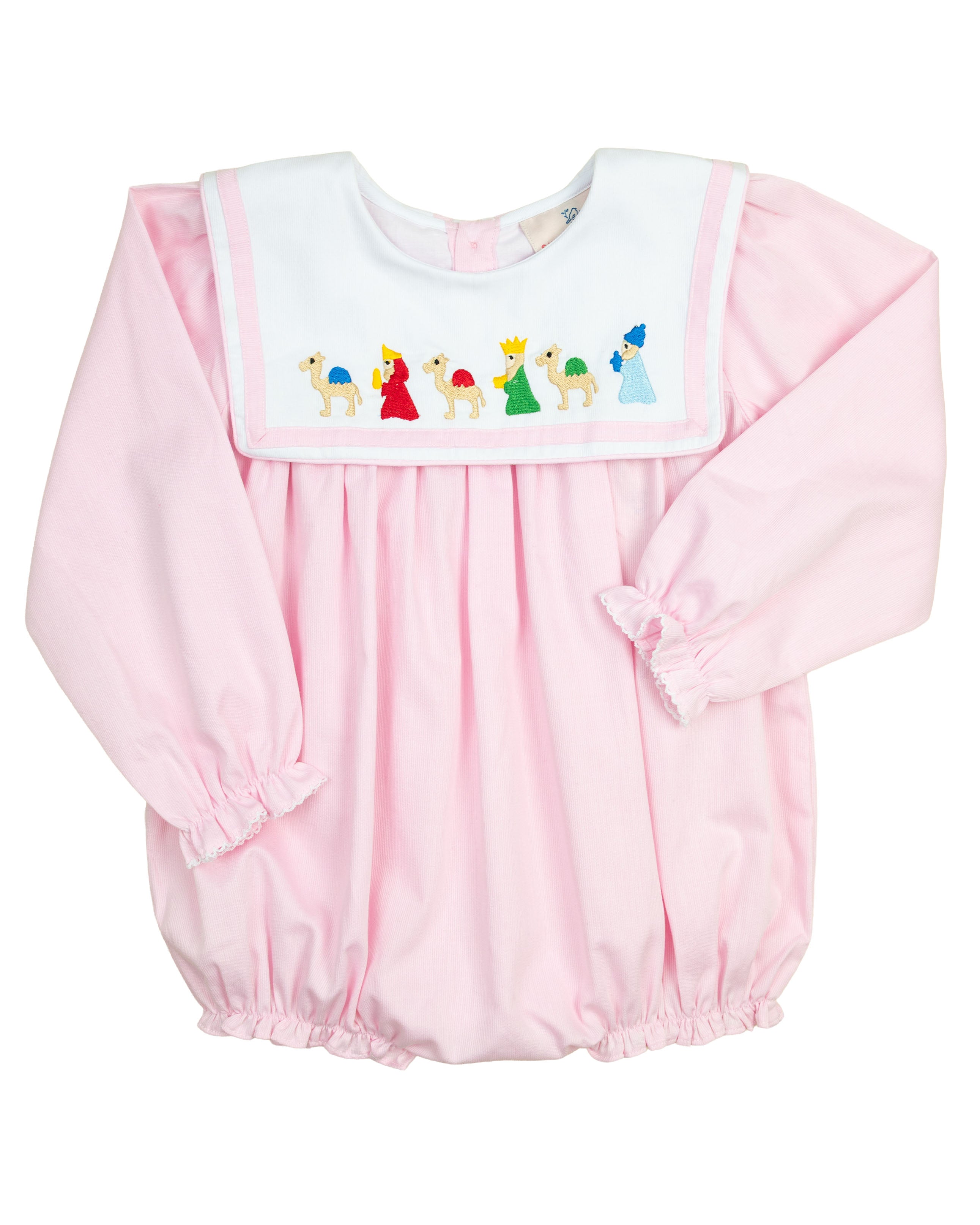 A timeless piece for the holiday season, the Wise Men Embroidered Bubble is as meaningful as it is adorable. Made in a soft pink fabric, this classic bubble features a white bib-style collar with the three wise men delicately hand-embroidered across the front. Perfect for Christmas celebrations, nativity events, or holiday photos, it’s a sweet way to dress your little one in the spirit of the season.