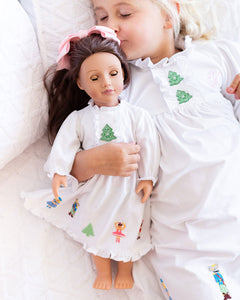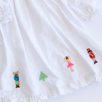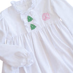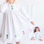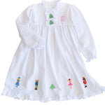 This is our best selling Christmas item year after year! This adorable white knit gown with ruffles on hem and buttons on chest is a Christmas staple. Iconic nutcracker images are hand embroidered on the hem. Perfect for the Christmas season and your favorite ballet!! Add a personal touch with a monogram on the left chest.