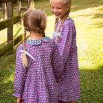 This dress is hand block printed in Jaipur on 100% poplin cotton fabric. We love the lightweight fabric for fall. It's super soft and perfect to dress up or down. Makes a great transitional piece.