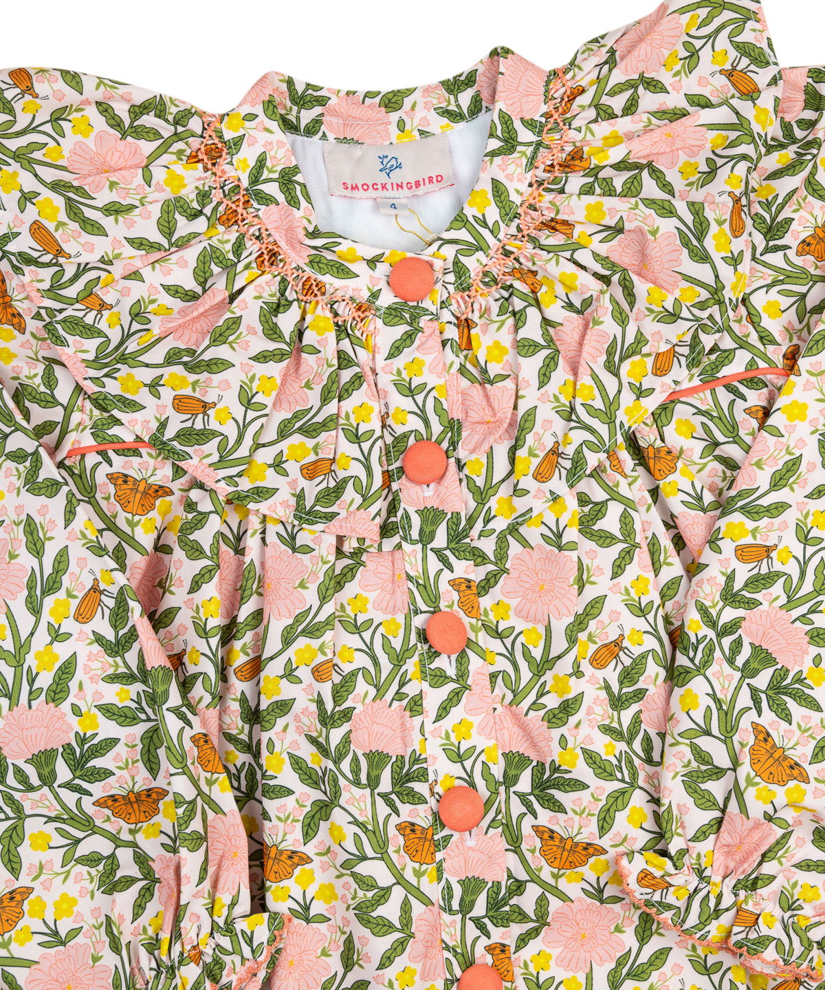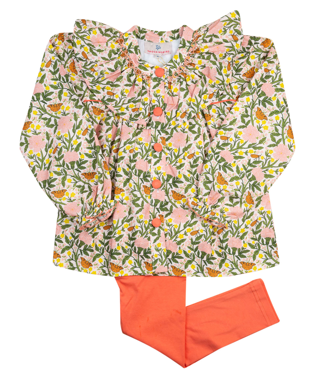 Our Pink Smocked William Morris Inspired Butterfly Legging Set makes fall dressing easy and adorable. The long-sleeve smocked top features a delicate floral pattern and pairs perfectly with soft leggings for an outfit that’s equal parts cute and comfy. A must-have for cooler weather adventures. Covered buttons adorn the front for an even more elegant look!