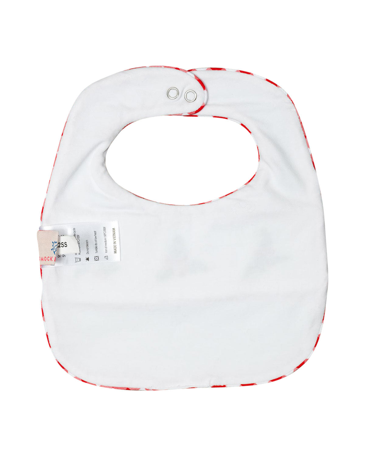 White bib trimmed in red gingham with smocked Christmas holly berries. A sweet bib for baby's first Christmas. Adjustable snaps.