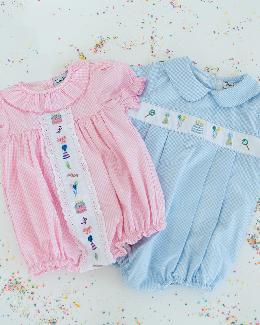 It's birthday party time and this bubble will be stunning on your little one! Cake, candy, party hats, and ribbons are hand embroidered down the center.