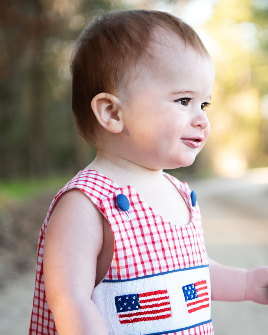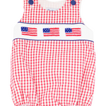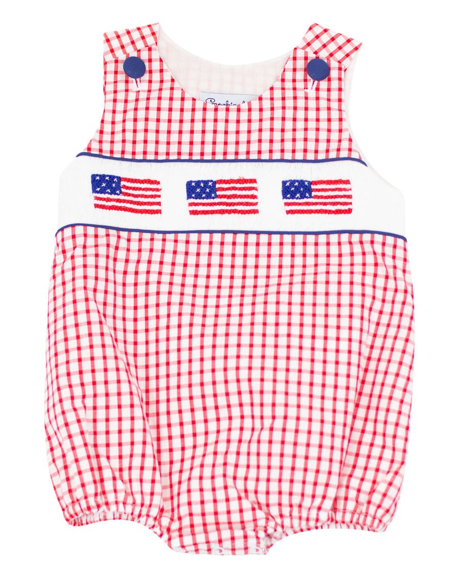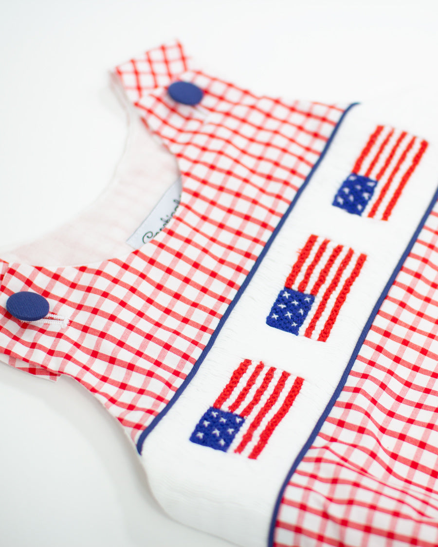 Red windowpane fabric bubble for boy with smocked flags across the chest. This adorable bubble is perfect for Memorial Day, 4th of July or any Summer Day. Metal snaps in stride.