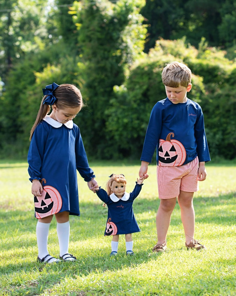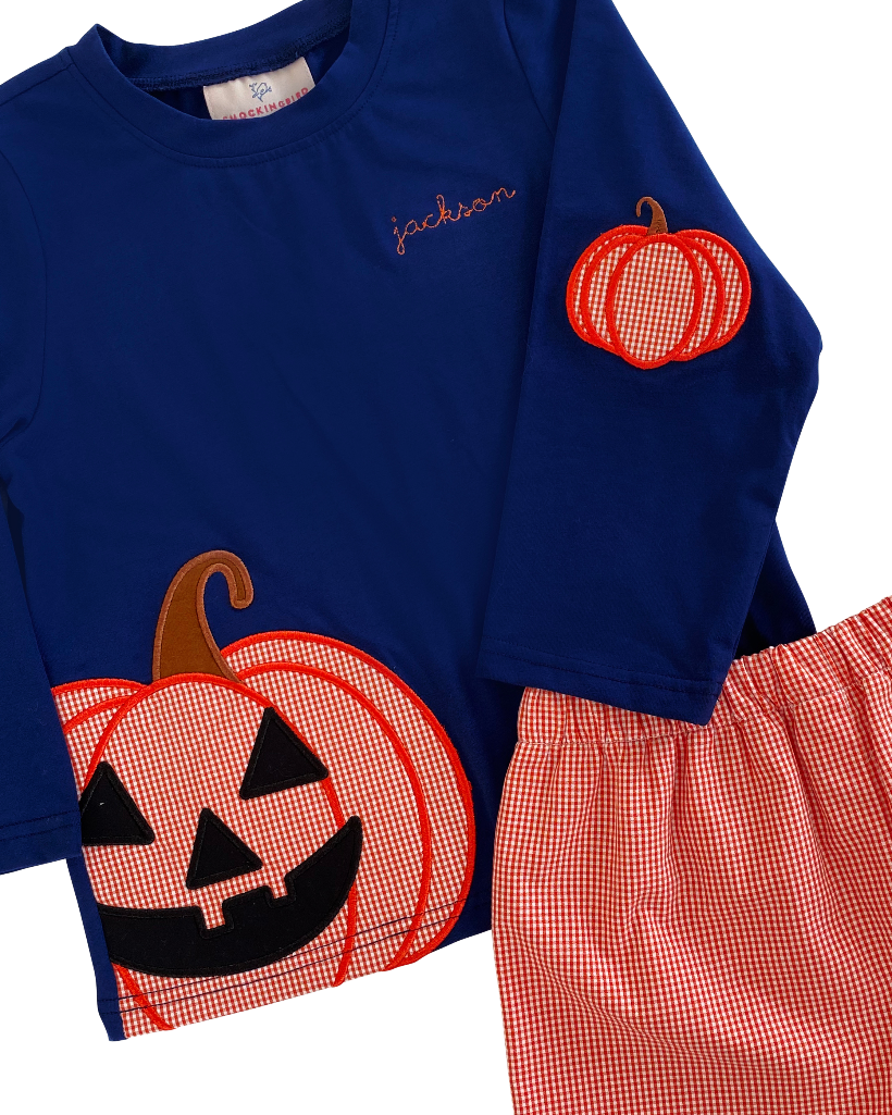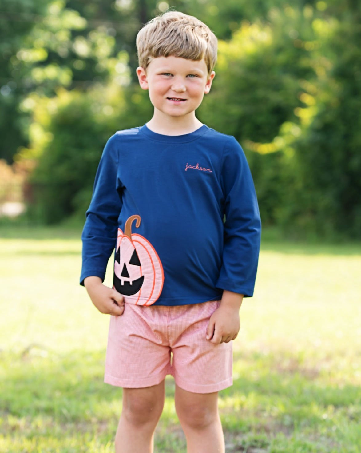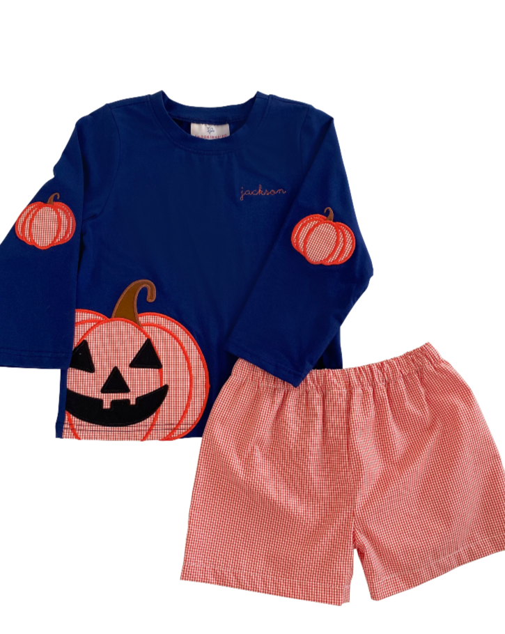 Pumpkin carving just got more fun with our festive Halloween Jack-o'-Lantern Applique Shorts Set. Perfect for Halloween, this set includes orange gingham shorts with an elastic waist and a long-sleeve navy knit top. The Halloween-themed Jack-o'-Lantern applique decorates the elbows and bottom of the shirt, adding a playful touch. Available in matching sibling sets with a coordinating trick-or-treat basket. Personalize it with a name or monogram for a special Halloween outfit!