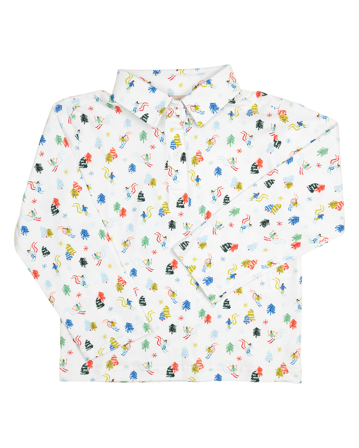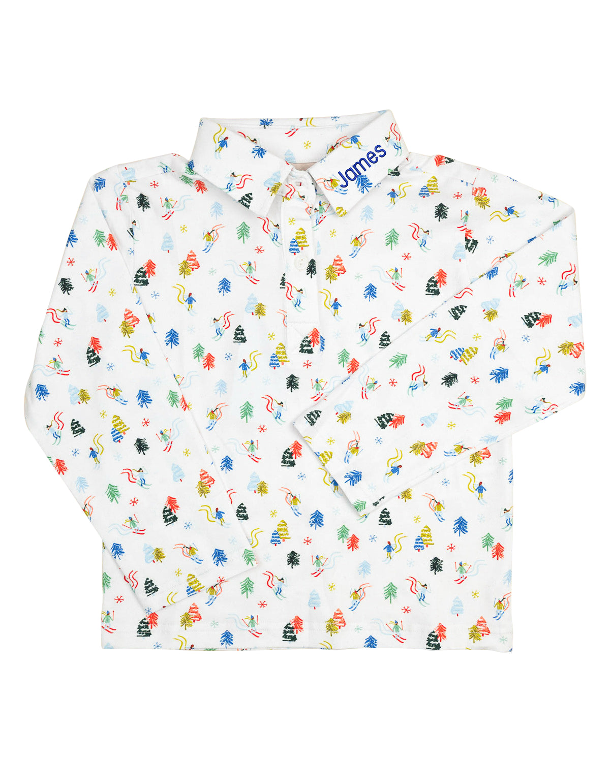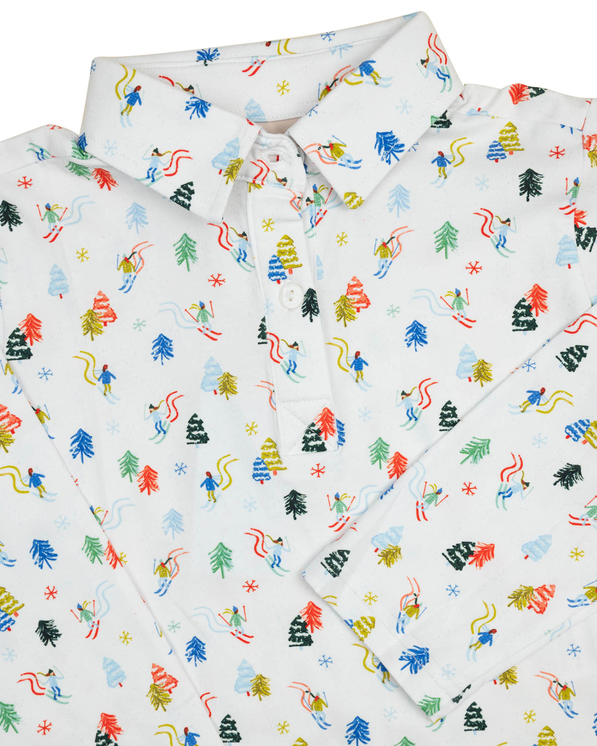 Capture the fun of the winter season with our Downhill Dash Ski Print Knit Polo Shirt! This charming knit shirt features a fun ski print print. Made from ultra-soft fabric, it’s perfect for holiday gatherings, après ski, Christmas parties, and winter play dates. Pair with matching sibling outfits for an extra-special seasonal look!