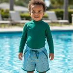 These swim trunks feature a playful fishing-inspired print for fun days by the water. Designed for comfort and easy movement, they’re perfect for pool and beach adventures. The cheerful design adds personality. A summer essential for active little ones.