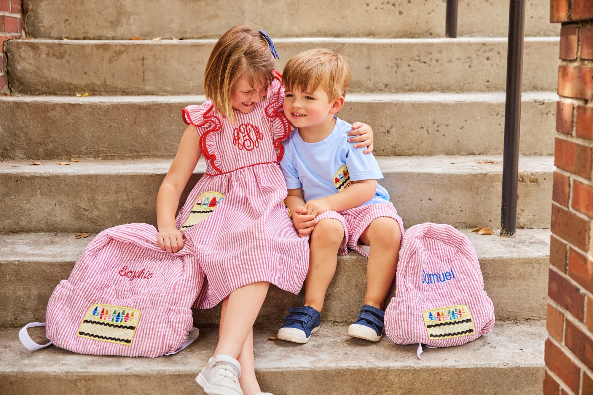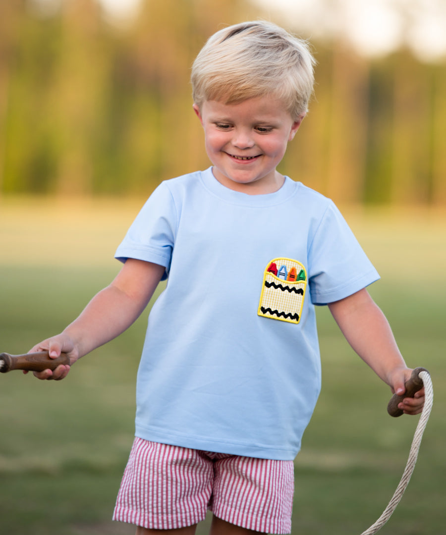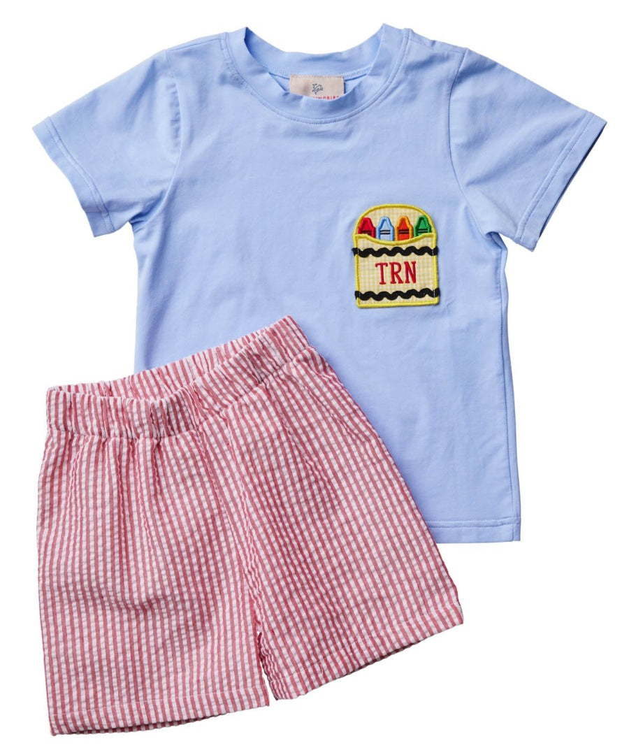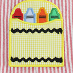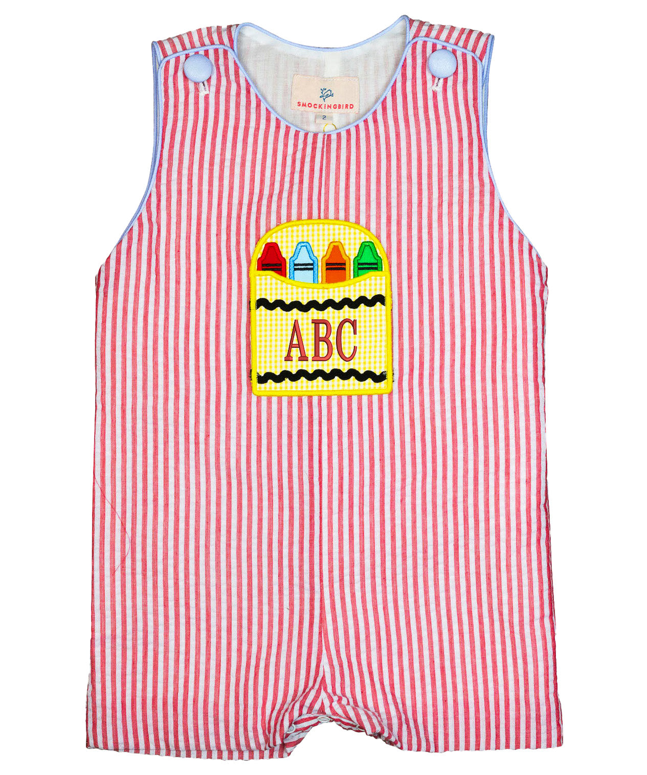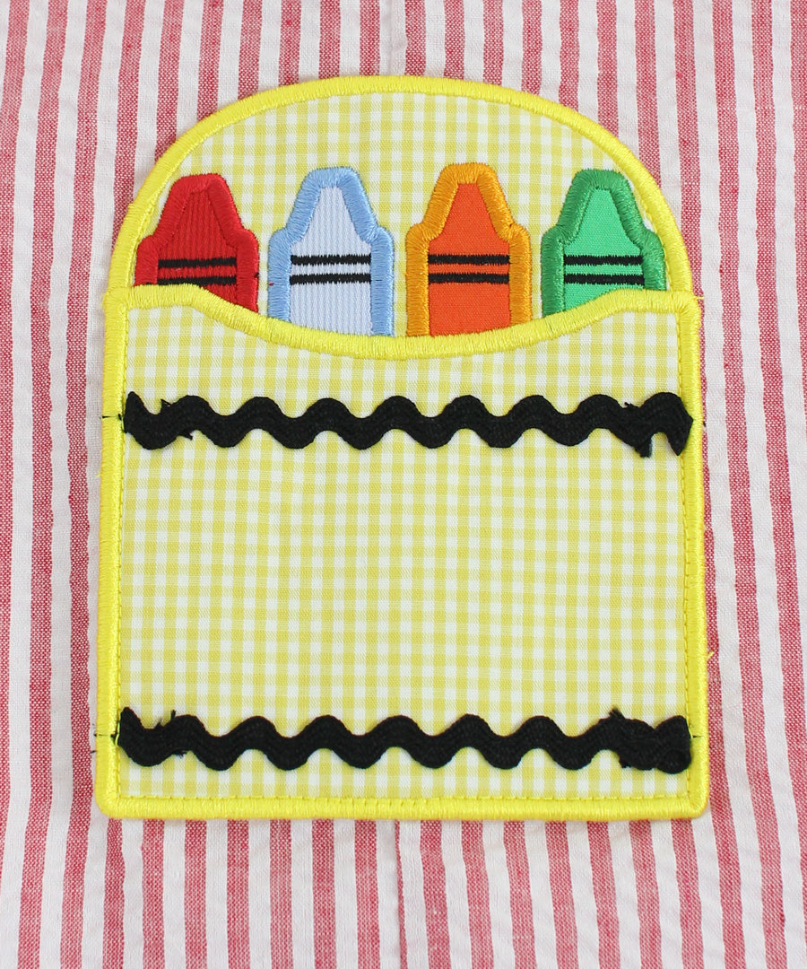 Color the world in happiness in this adorable shortall with crayon applique pockets. You will love the added details of light blue buttons and trim around the top. Conveniently snaps in stride for easy access for parents. Make back to school all the more cute with this matching sibling style. Add a straight font monogram in red thread for a personal touch.