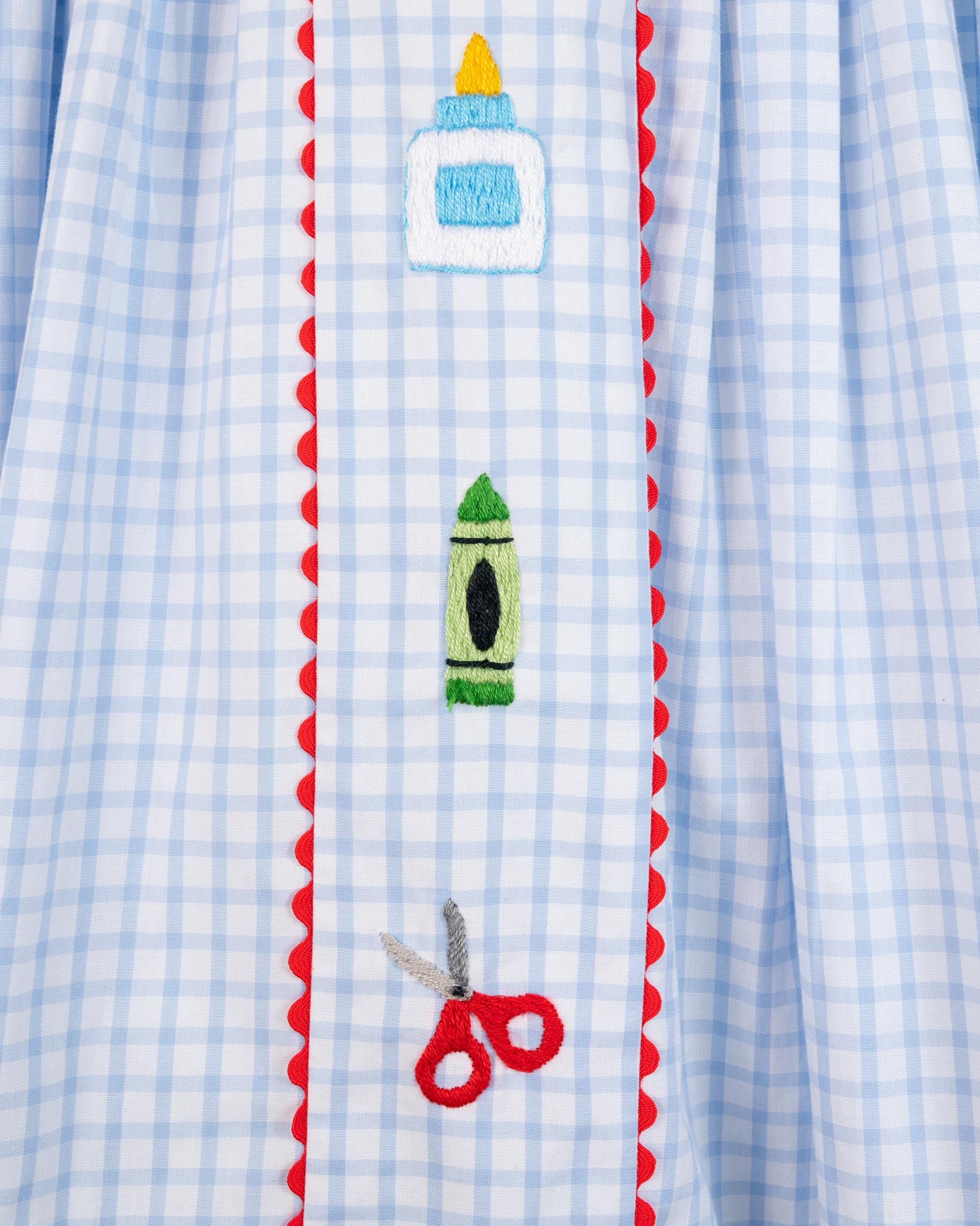 The cutest school supplies ever! This bubble features classroom favorites embroidered down the center, classic red smocking, short puff sleeves and a peter pan collar with red trim. Snaps in the stride for easy changing. Add a name to the collar in vintage cursive for a personal touch!