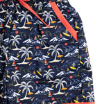 Enjoy a summer filled will fun in the sun in these tropical swim trunks. These trunks feature a print with palm trees, surfing, and sailboats. They have orange trim and a drawstring waist for a perfect fit.