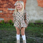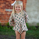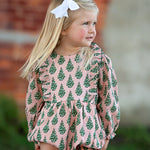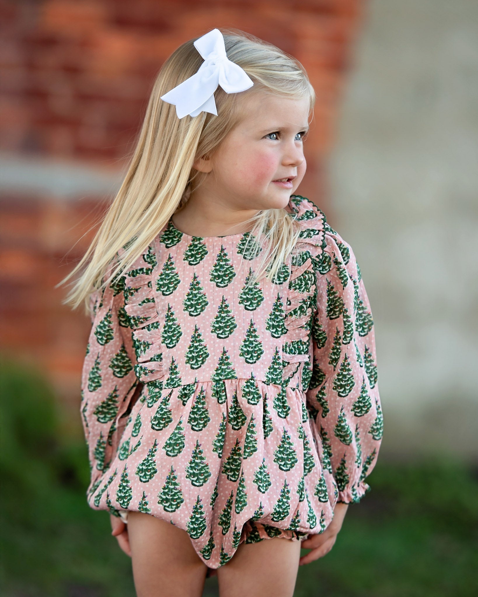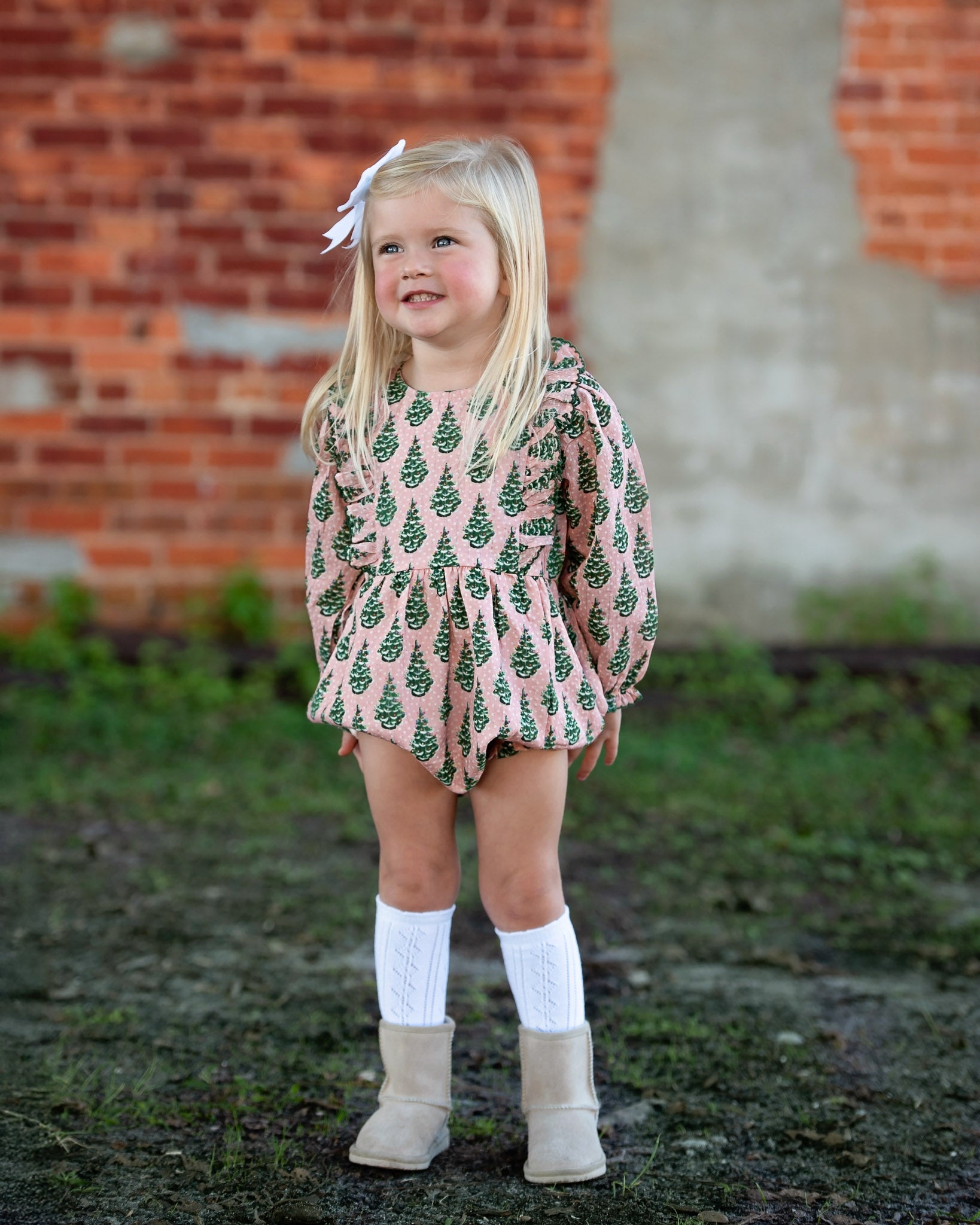 A festive favorite for your little one! The Vintage Ceramic Christmas Tree Bubble blends holiday charm with vintage-inspired elegance. Featuring a sweet Christmas tree print with silver lurex shimmer, ruffle accents, and long sleeves, this bubble is as cozy as it is adorable. The easy snap closures make diaper changes a breeze, ensuring both style and convenience this holiday season.