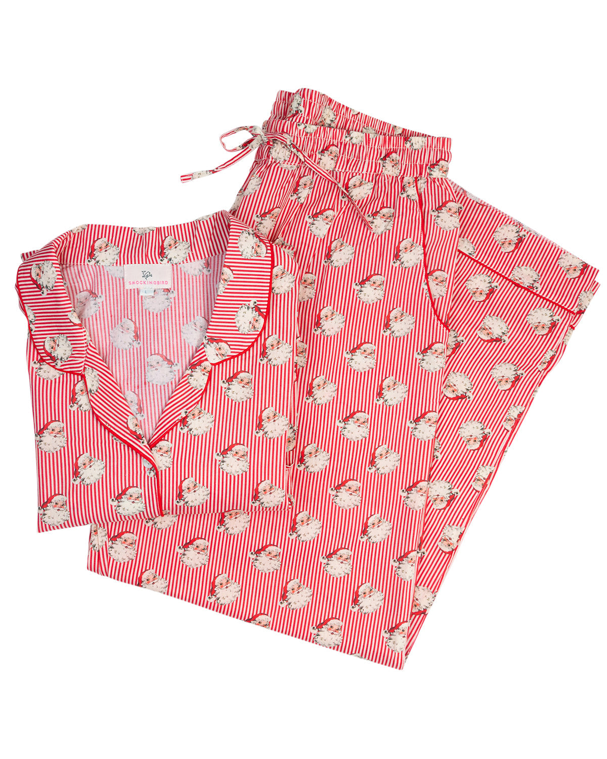 Red Striped Vintage Santa Button Down Ladies Pajama Set features jolly vintage Santa faces throughout and a button down front. Perfect for opening early morning Christmas presents.