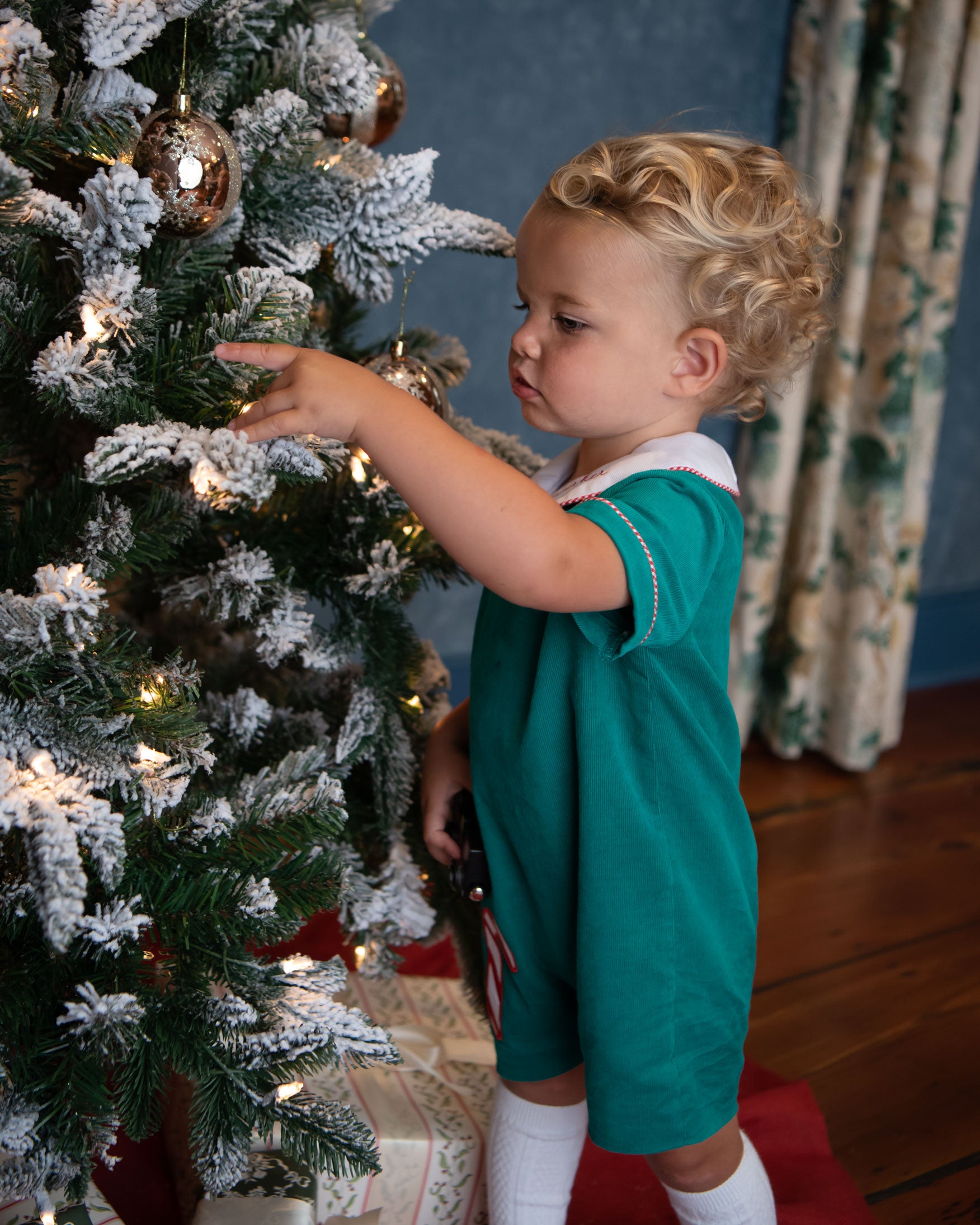 Stroll down candy cane lane in the sweetest candy can applique corduroy shortall. Rounded peter pan collard and metal snaps in stride—the perfect holiday outfit for school or family time. Add a name or monogram for a personal touch.