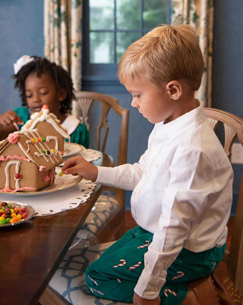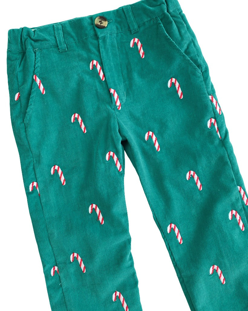 Gingerbread house building needs Candy Canes! Our Candy Cane Embroidered Corduroy Pants are perfect to wear and match with your friends. The pants include zipper in front, pockets and belt loops. Growing boys need elastic backs and adjustable waistbands. Don't wait! You will adore the embroidered candy canes all over the corduroy.