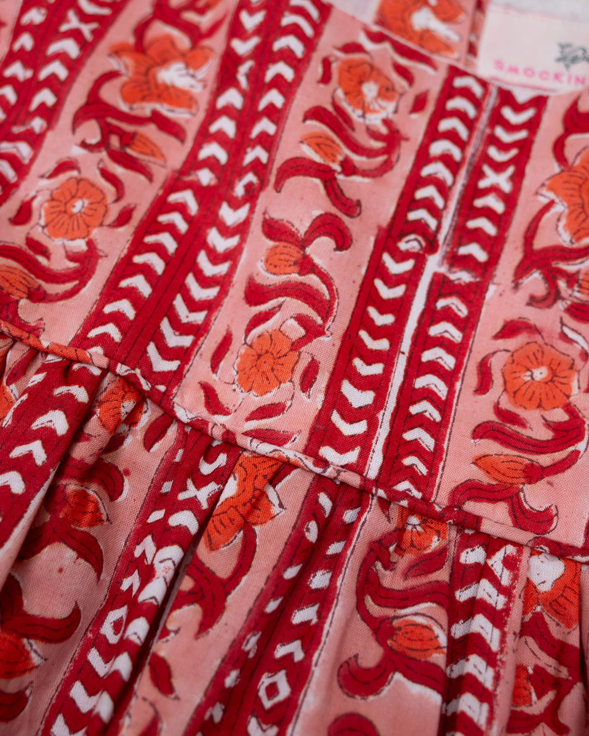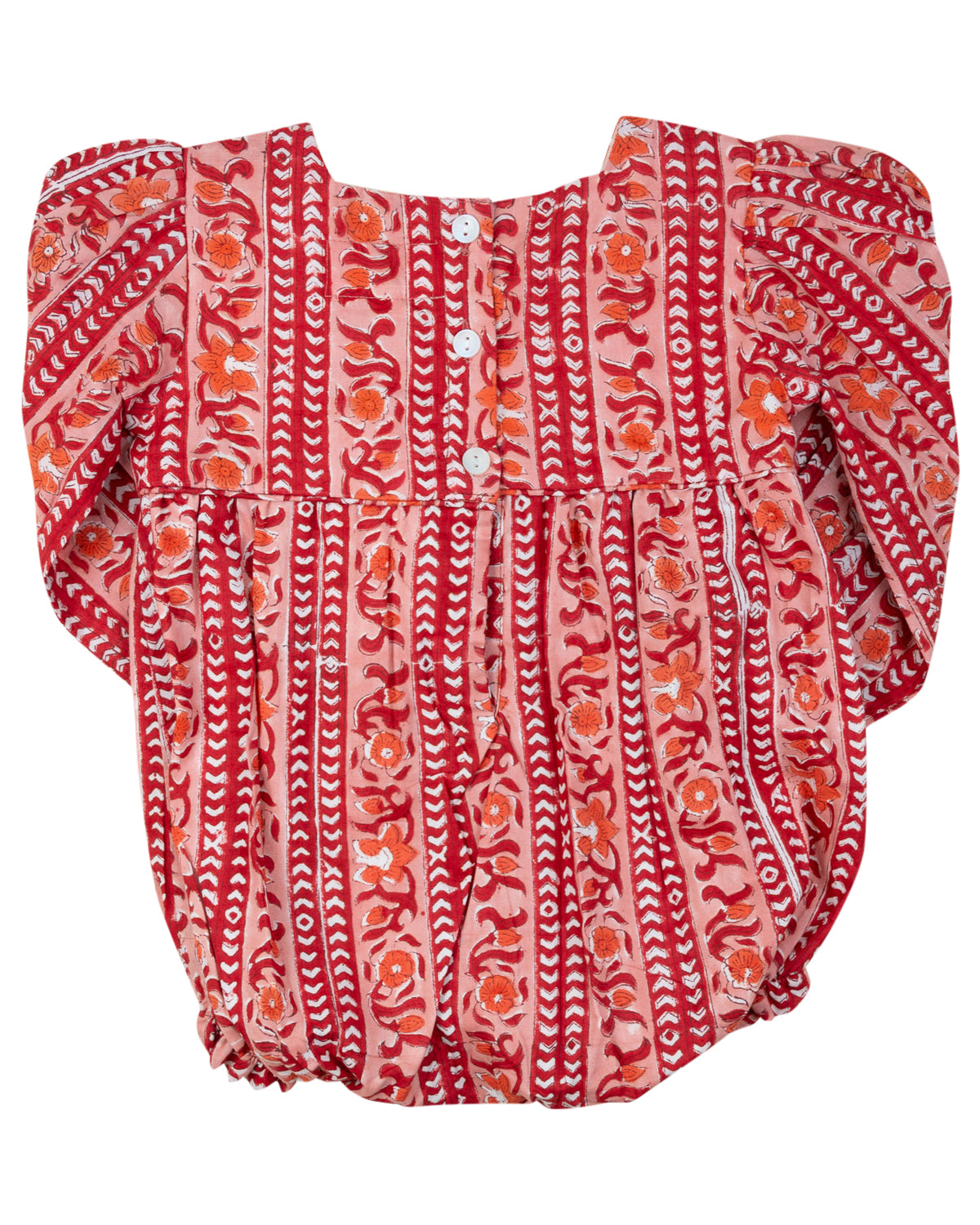 Make holiday moments extra special with our Persimmon Block Print Bubble! Designed for your little one, this charming bubble showcases a festive red and pink floral block print, long ruffle-trimmed sleeves, and a square neckline for an adorable, heirloom-inspired look. The elastic leg openings ensure a comfy fit, making it perfect for seasonal celebrations and cozy winter days.