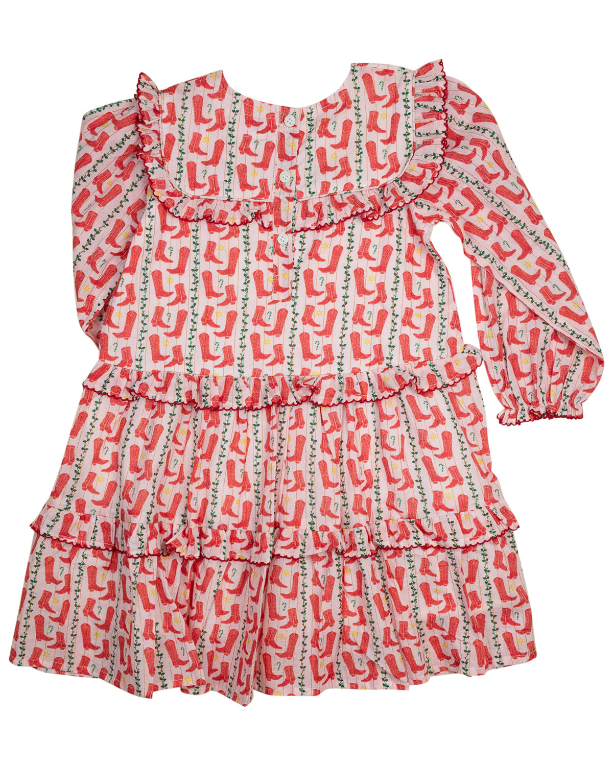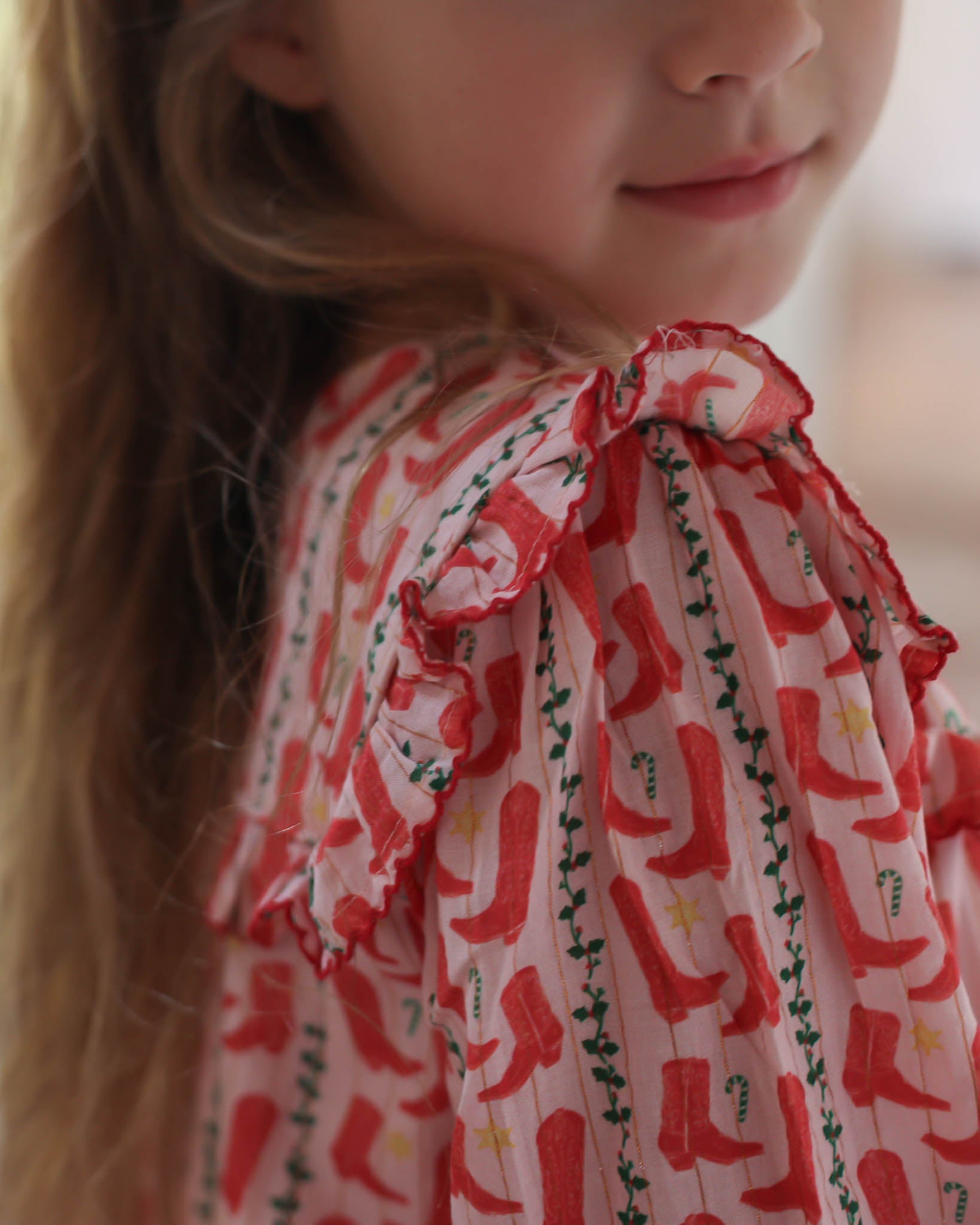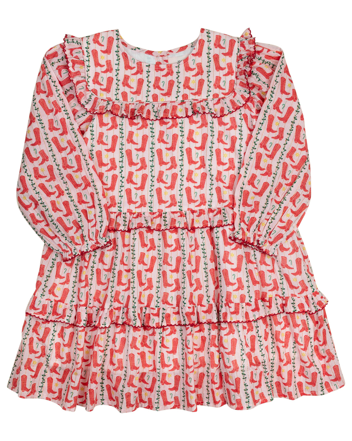 The Cowboy Boots and Candy Canes Twirl Dress combines holiday sweetness with playful charm. Featuring a festive Nashville-inspired country Christmas print and twirl-friendly skirt, this dress is made for little dancers who love to celebrate in style. Perfect for Christmas events, holiday portraits, and joyful family gatherings.