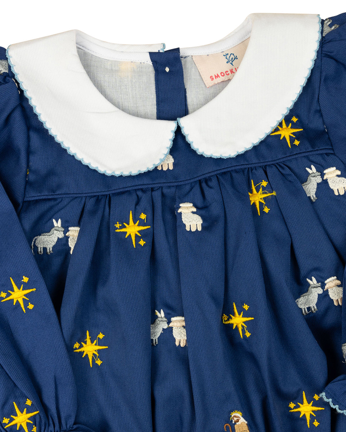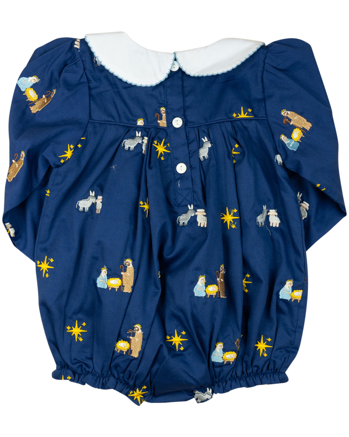 Celebrate the spirit of the season with our Nativity Embroidered Navy Bubble. This timeless piece features delicate embroidery of the Nativity scene on a rich navy backdrop, complete with a crisp white peter pan collar. Long sleeves with ruffle cuffs add a cozy touch, making this the perfect outfit for Christmas gatherings, church services, and holiday photos.