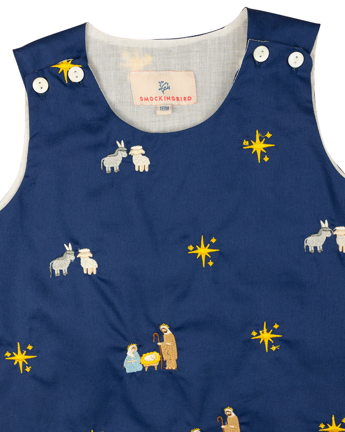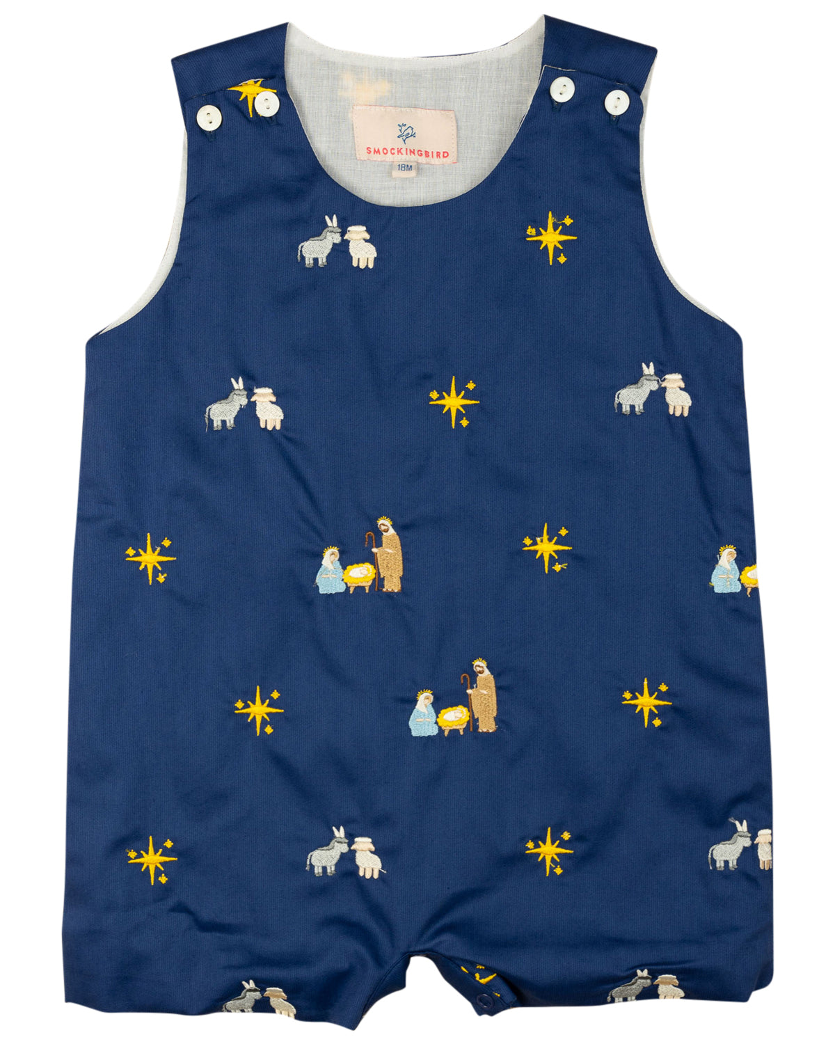 Dress your little one in timeless holiday charm with our Nativity Embroidered Navy Shortall. Designed with classic embroidered Nativity motifs, this shortall is both comfortable and stylish. Metal snaps in stride.