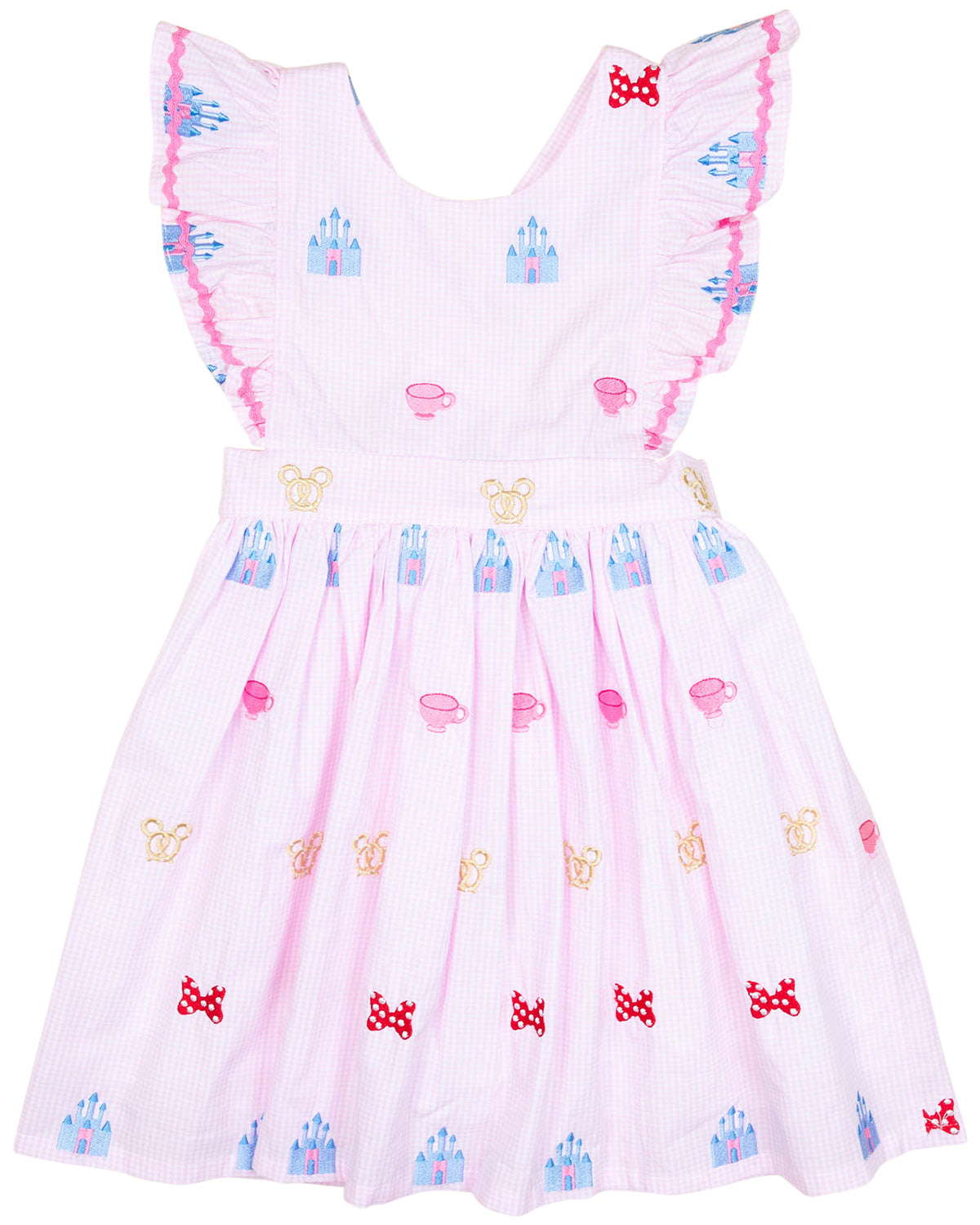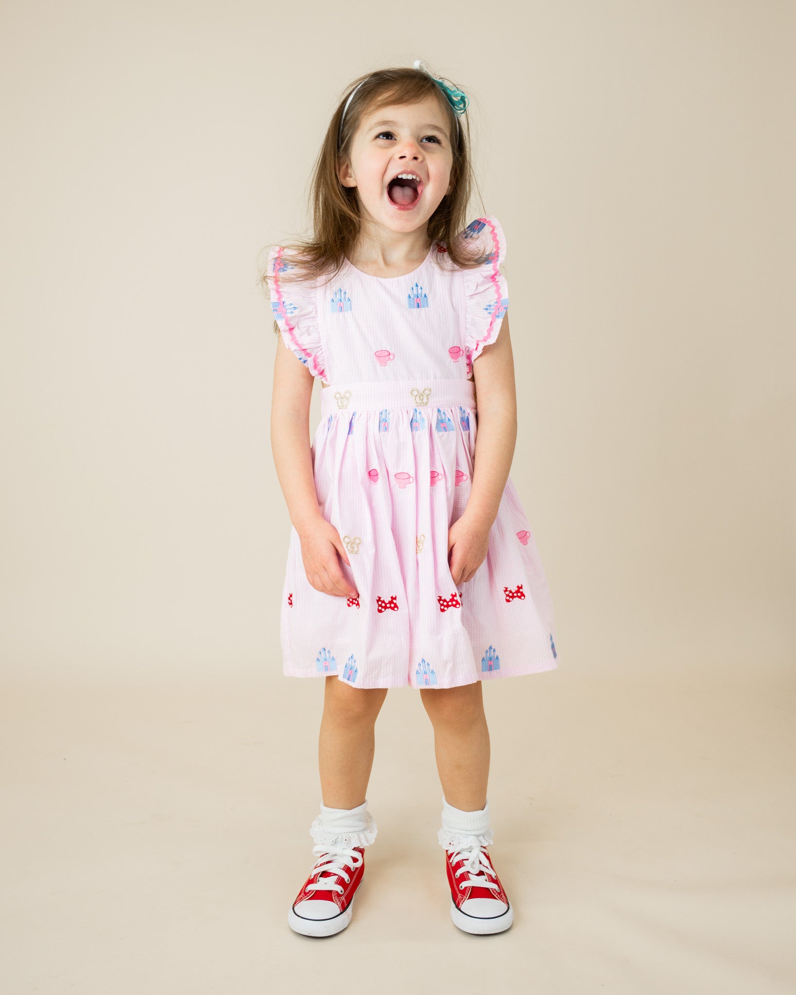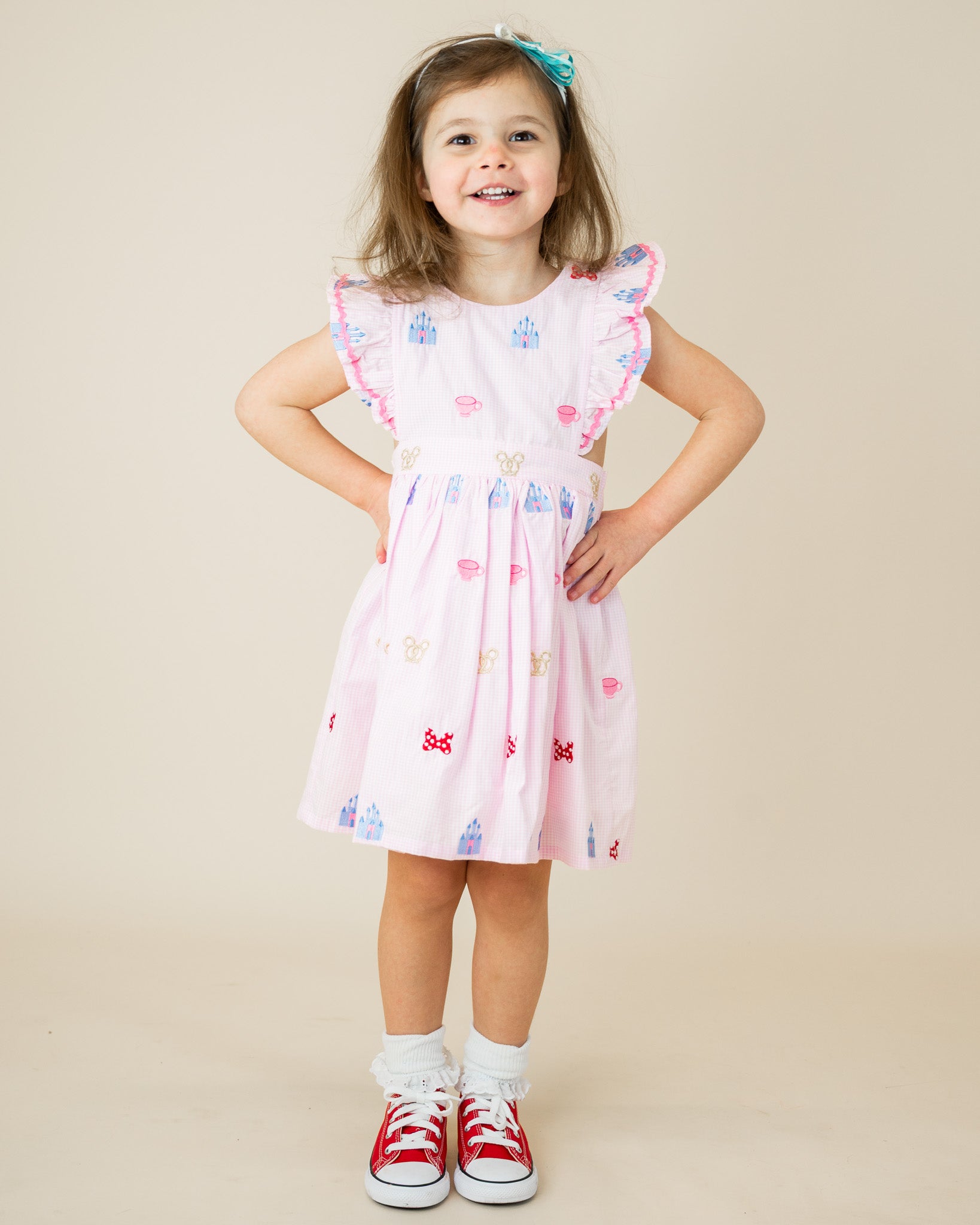 Let the magic of the parks come to life in this embroidered girls dress. This dress feature some mouse favorites throughout and is the perfect outfit for a trip to Disney!