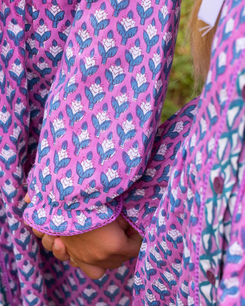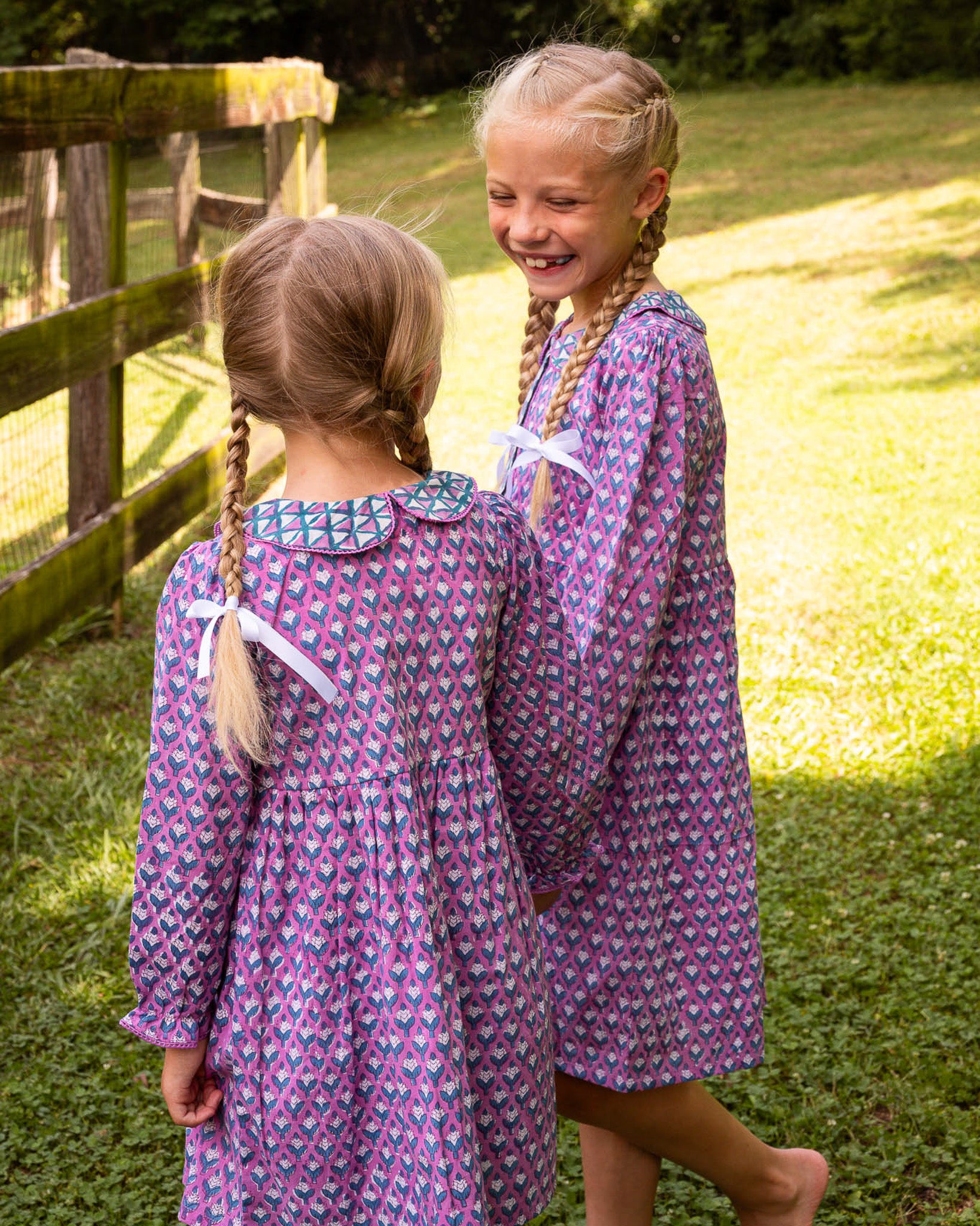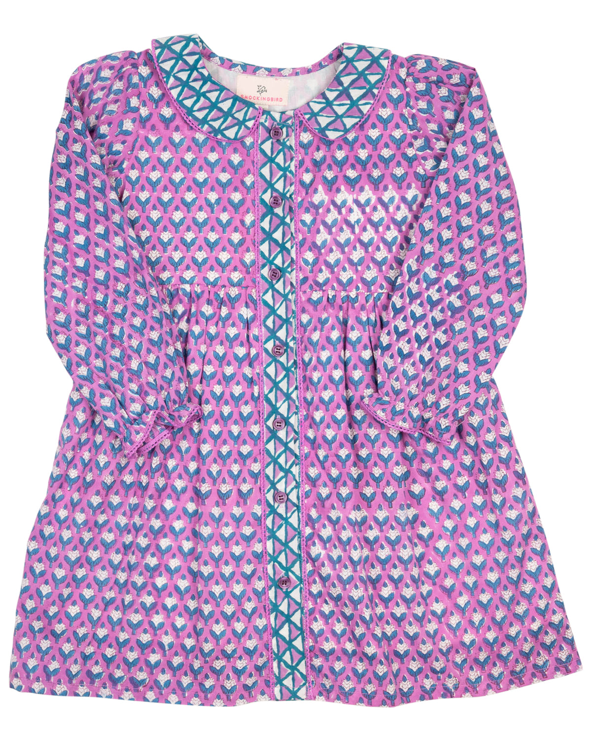 This dress is hand block printed in Jaipur on 100% poplin cotton fabric. We love the lightweight fabric for fall. It's super soft and perfect to dress up or down. Makes a great transitional piece.