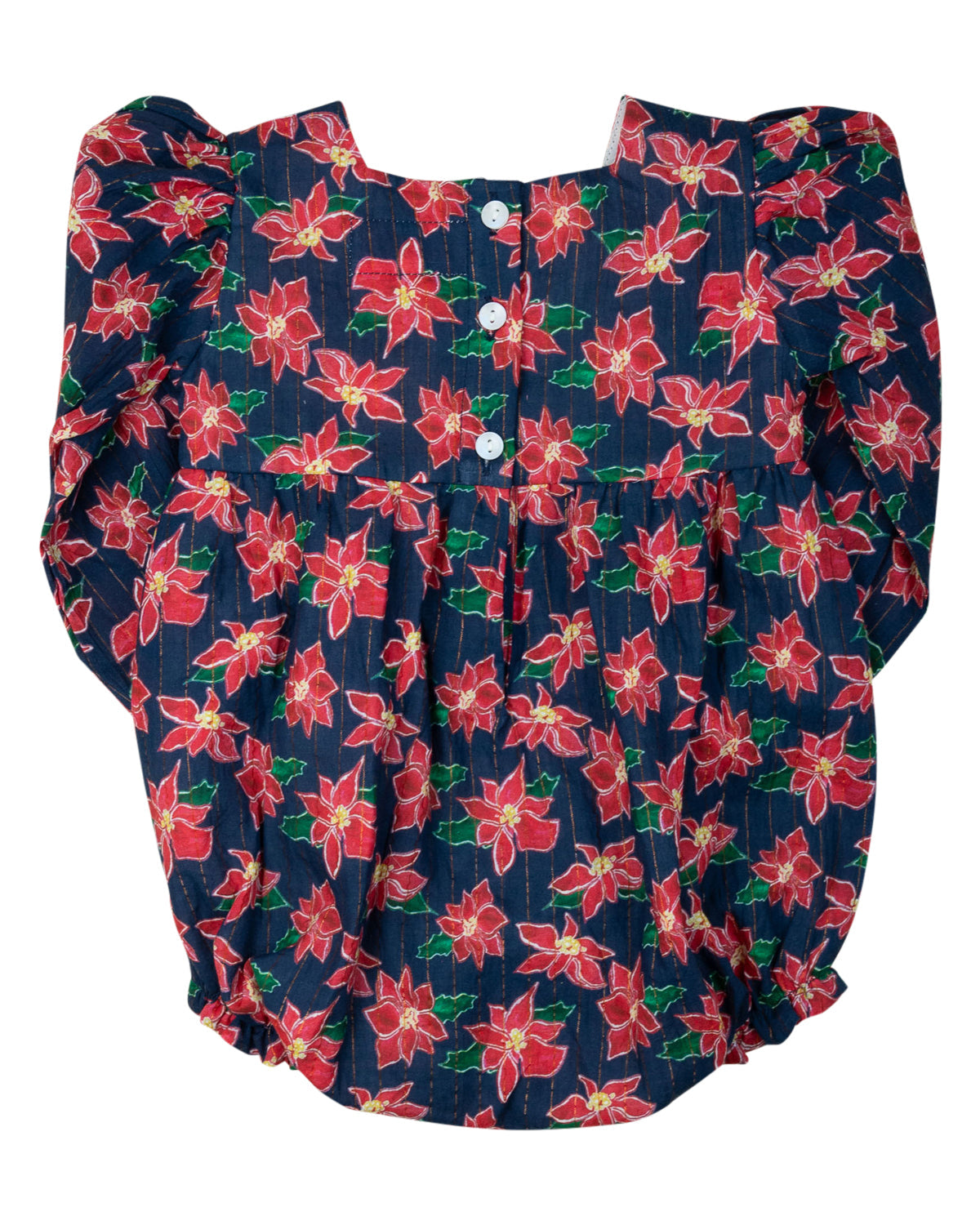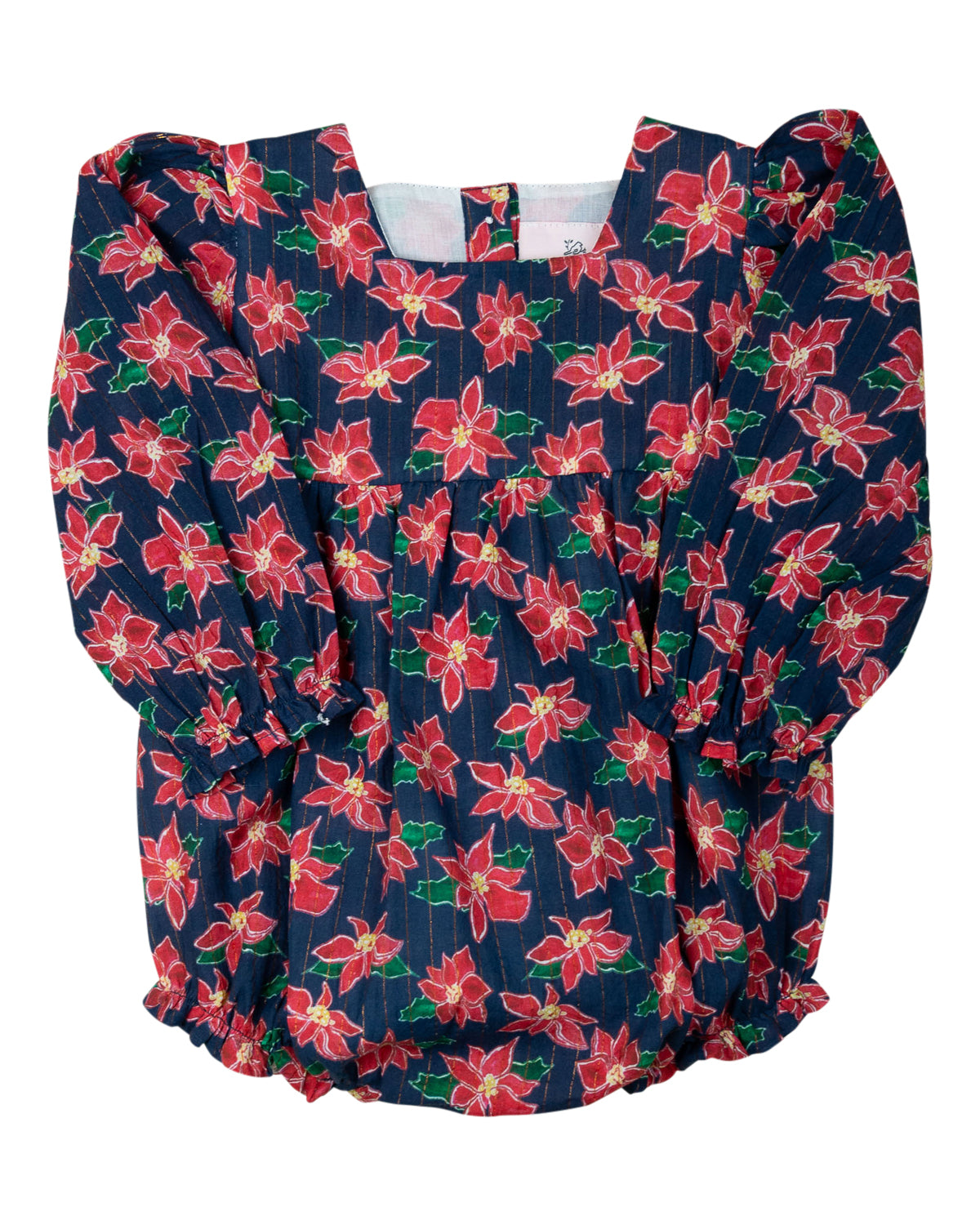 Dress your little one in festive charm with our Poinsettia With Gold Lurex Bubble. The rich poinsettia print and delicate gold lurex stripes add a touch of holiday sparkle, while the soft fabric and long sleeves ensure cozy comfort. Ruffle details and a square neckline complete the look, making this the perfect outfit for Christmas festivities and sibling matching moments.