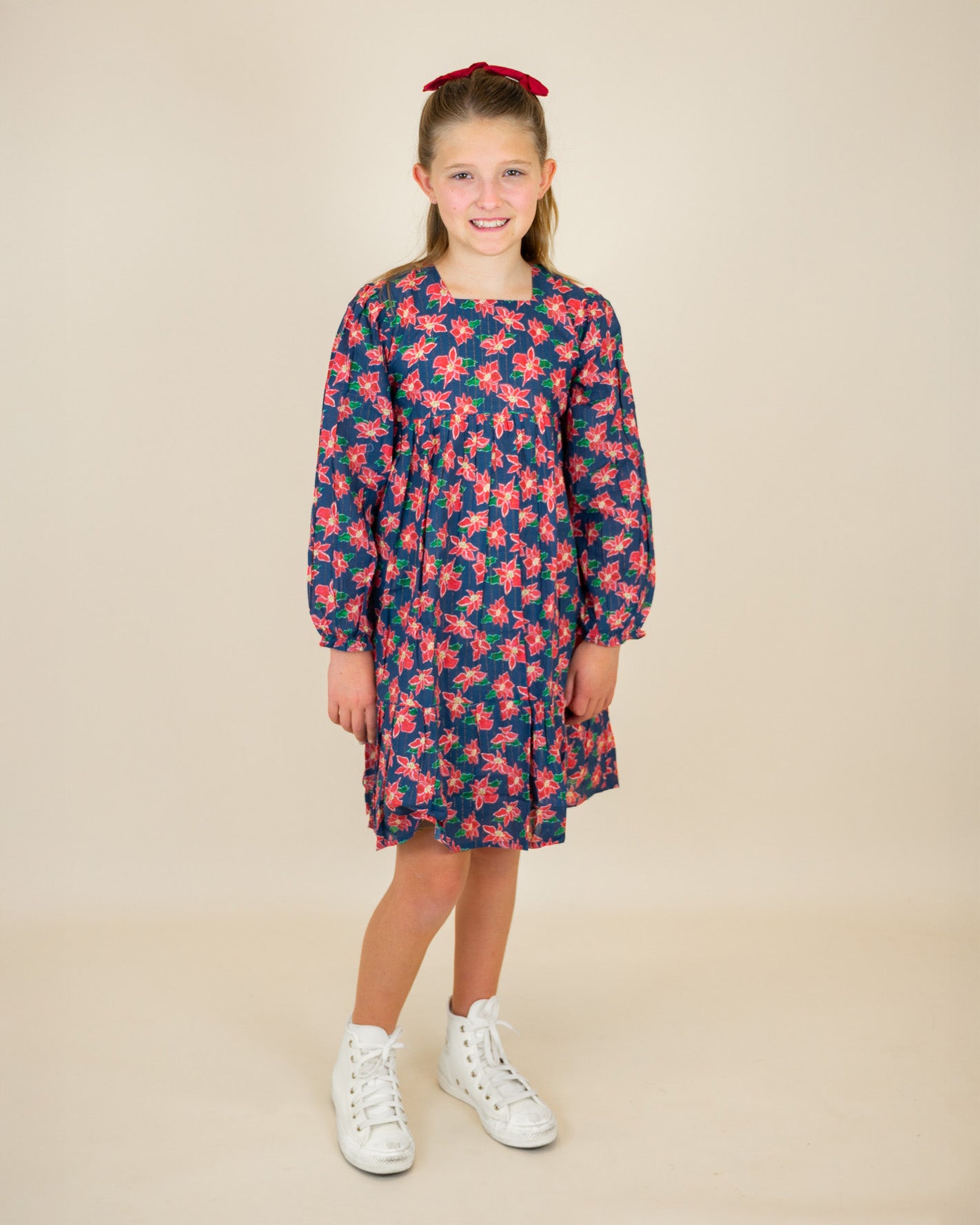 Make holiday memories shine with our Poinsettia With Gold Lurex Dress! Featuring a stunning poinsettia print accented with shimmering gold lurex stripes, this festive dress is designed for elegance and comfort. Long sleeves, a gathered waist, and a ruffled hem create a charming silhouette, making it perfect for Christmas celebrations, family gatherings, and holiday photos.
