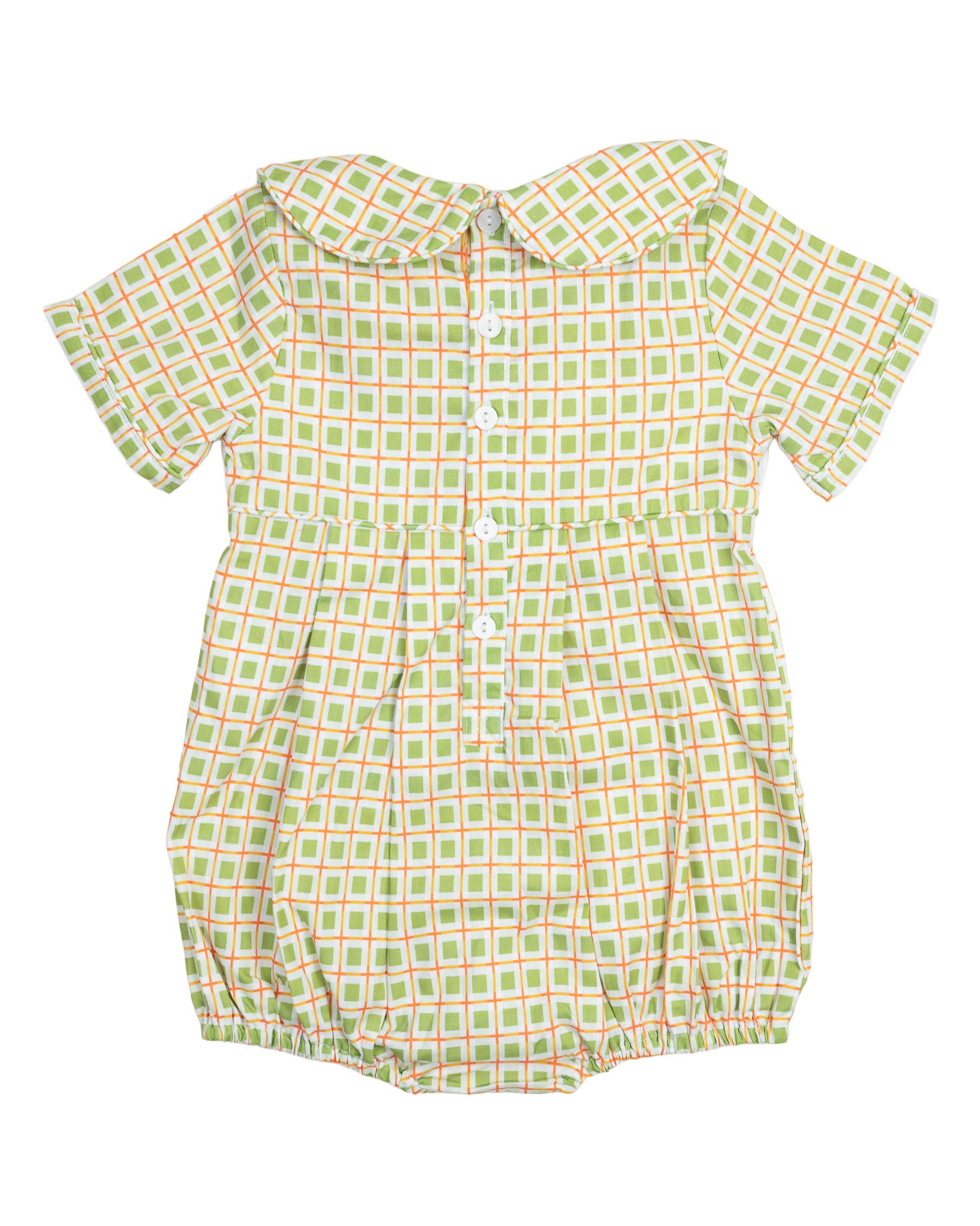 Match the season with this classic! The Pumpkin Smocked Plaid Boy Bubble features hand-smocked pumpkins, a Peter Pan collar, and short sleeves—designed for both comfort and cuteness. Ideal for Thanksgiving gatherings and cool autumn strolls.