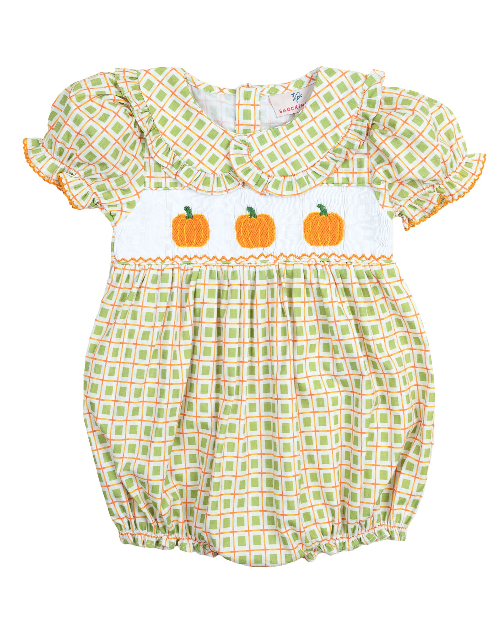 Pumpkin perfection for your little one! The Pumpkin Smocked Plaid Girl Bubble is full of fall charm with its hand-smocked pumpkin detail, ruffle collar, and comfy bubble silhouette. Snaps at the bottom make for easy changes, and the plaid fabric is as festive as it is soft.