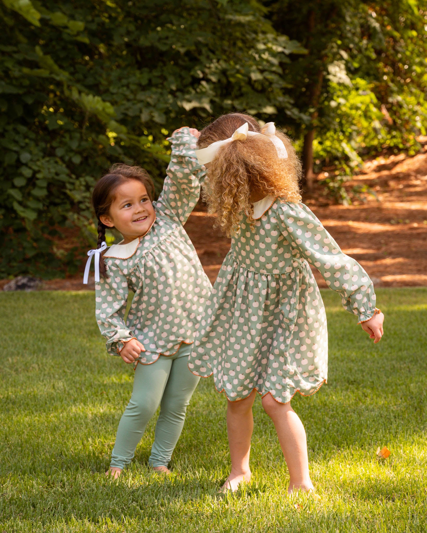 If you are looking for something that will stand out this fall, look no further. This sage green pumpkin legging set is so darling for all occasions. This legging set features a top with a sage green background and cream color pumpkins and matching green leggings. Add a name to the collar in vintage cursive for a personal touch.
