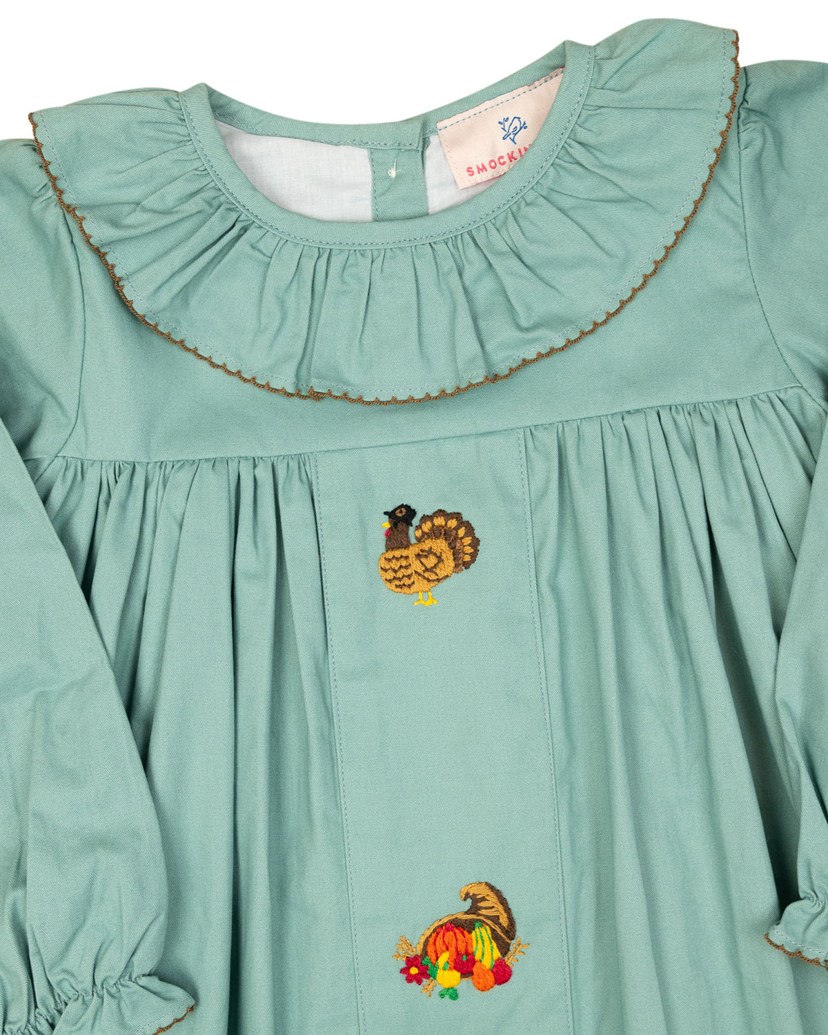 Your little turkey will fall in love with this Turkey Embroidered Sage Green Dress. Dress features long bishop sleeves, ruffled collar, and adorable embroidered turkeys with pilgrim hats and a cornucopia. Add a name in vintage cursive on the left chest for a personalized touch.