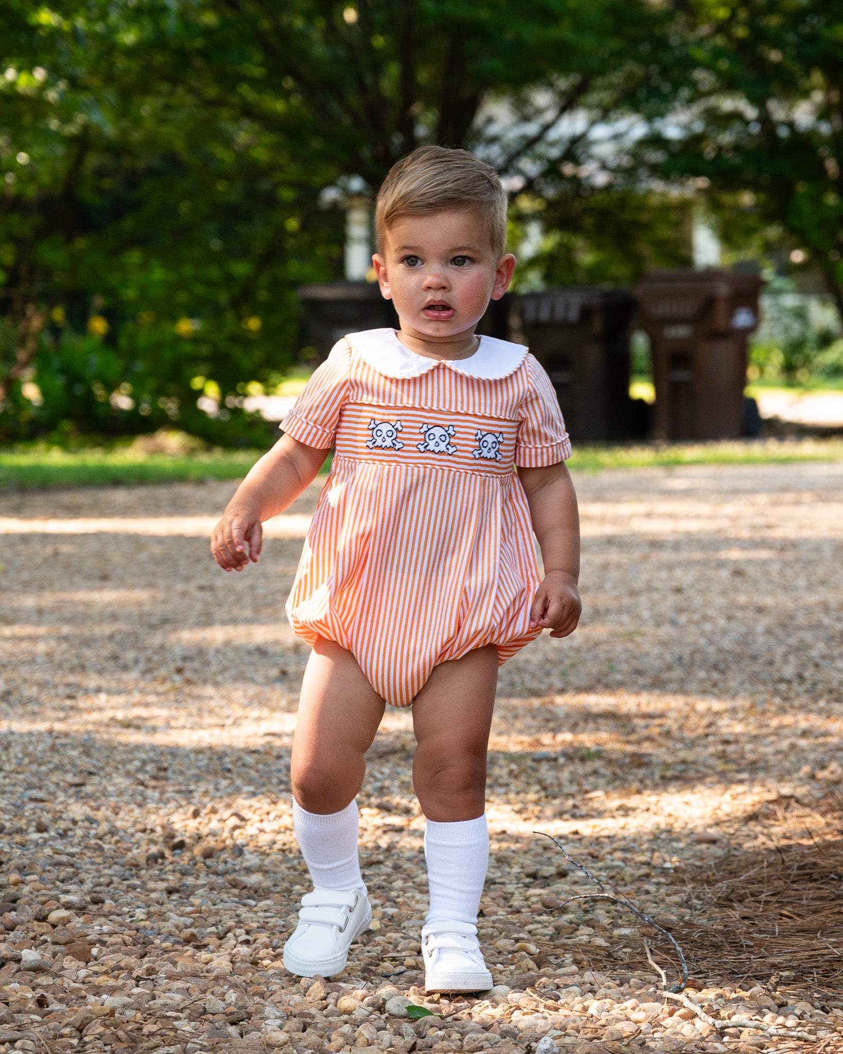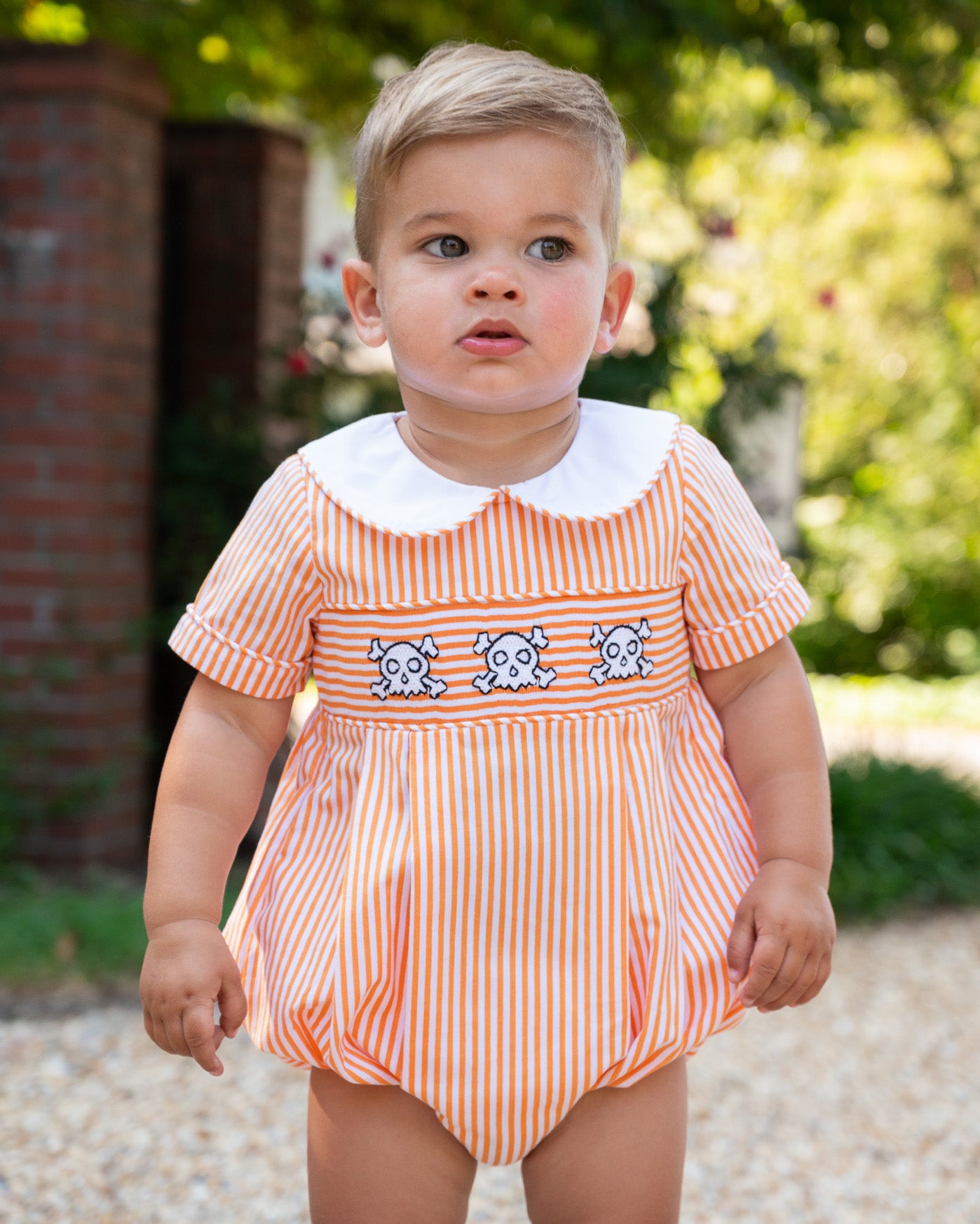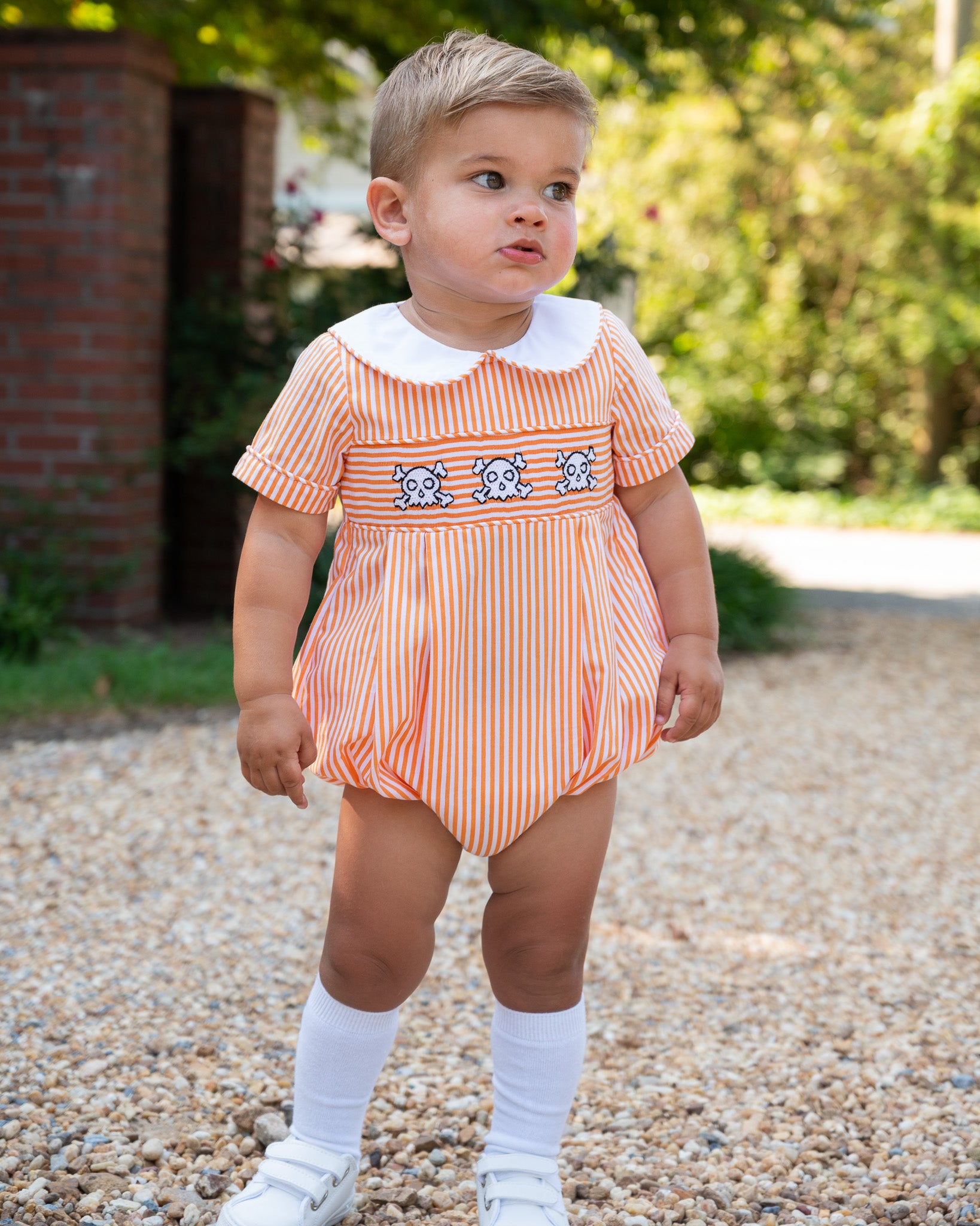 Let your little one join the Halloween fun in our Skull and Bones Smocked Boy Bubble. With playful smocking, comfy cotton fabric, and classic baby boy styling, it’s the perfect pick for festive fall moments.