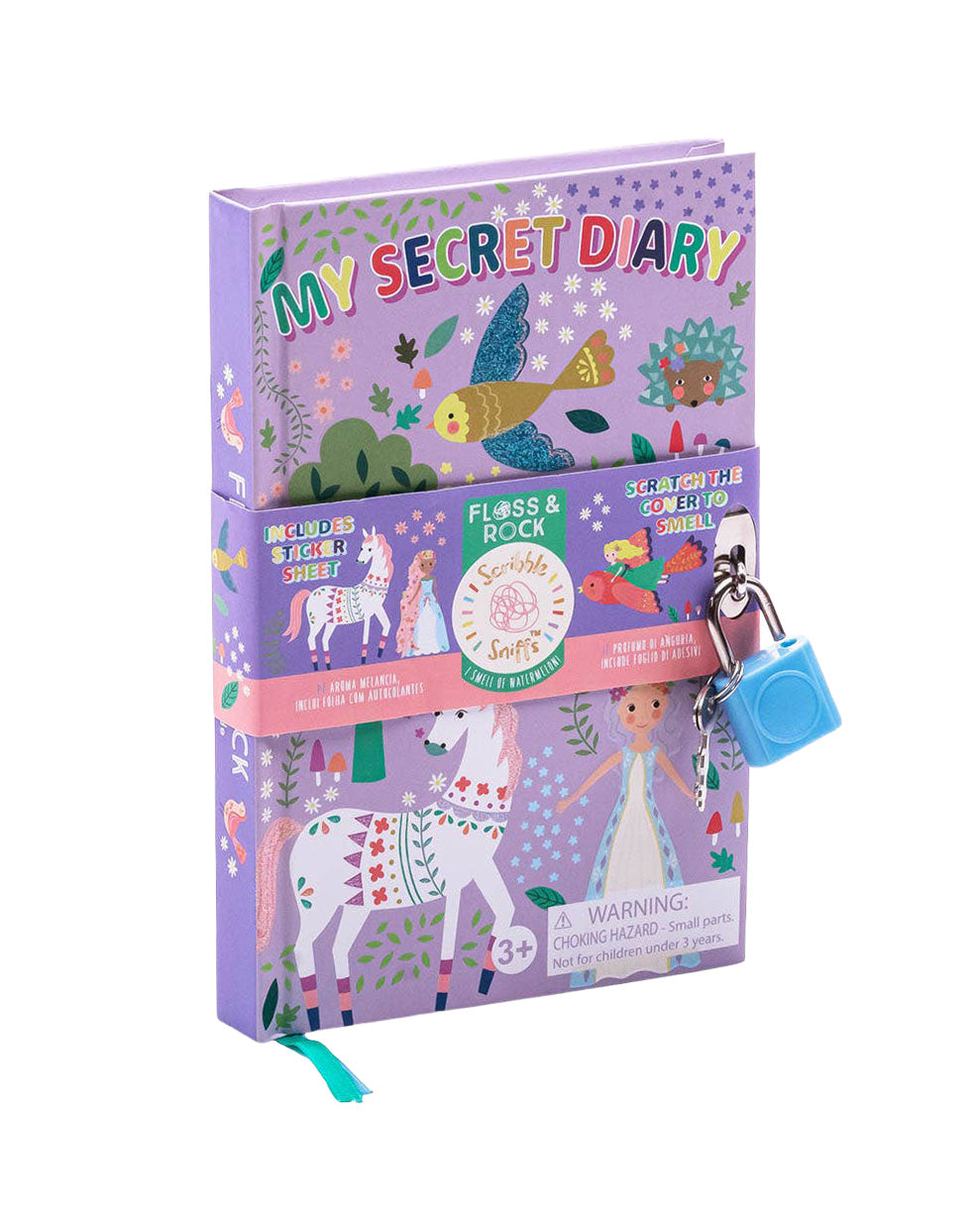 Wow…a SCENTED and SECRET diary. This Fairy Tale themed secret diary smells of Watermelon. Simply scratch the cover and you will reveal the scent. Includes a padlock and key AND a fun shaped sticker sheet with Princesses, Horse & Carriage and much more. There are multi color ribbon page holders too. Pages are lined. Perfect for travel and taking out and about. Scratch & Sniff cover. Smells of Watermelon. Includes Sticker Sheet. Padlock & Key. Lined Pages. 2 colored ribbon page holders. Recommended age 3+.