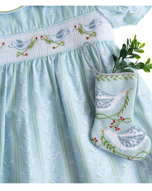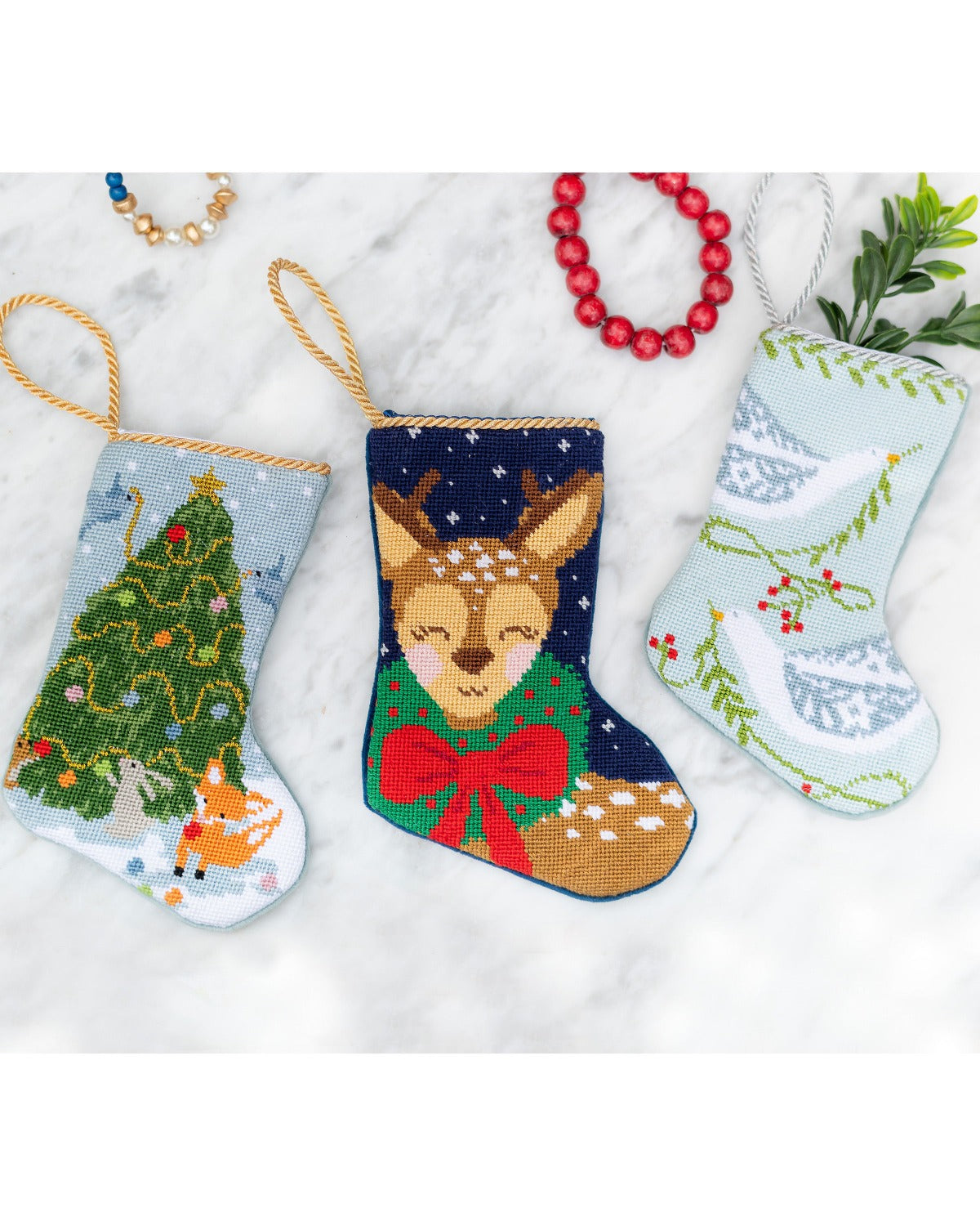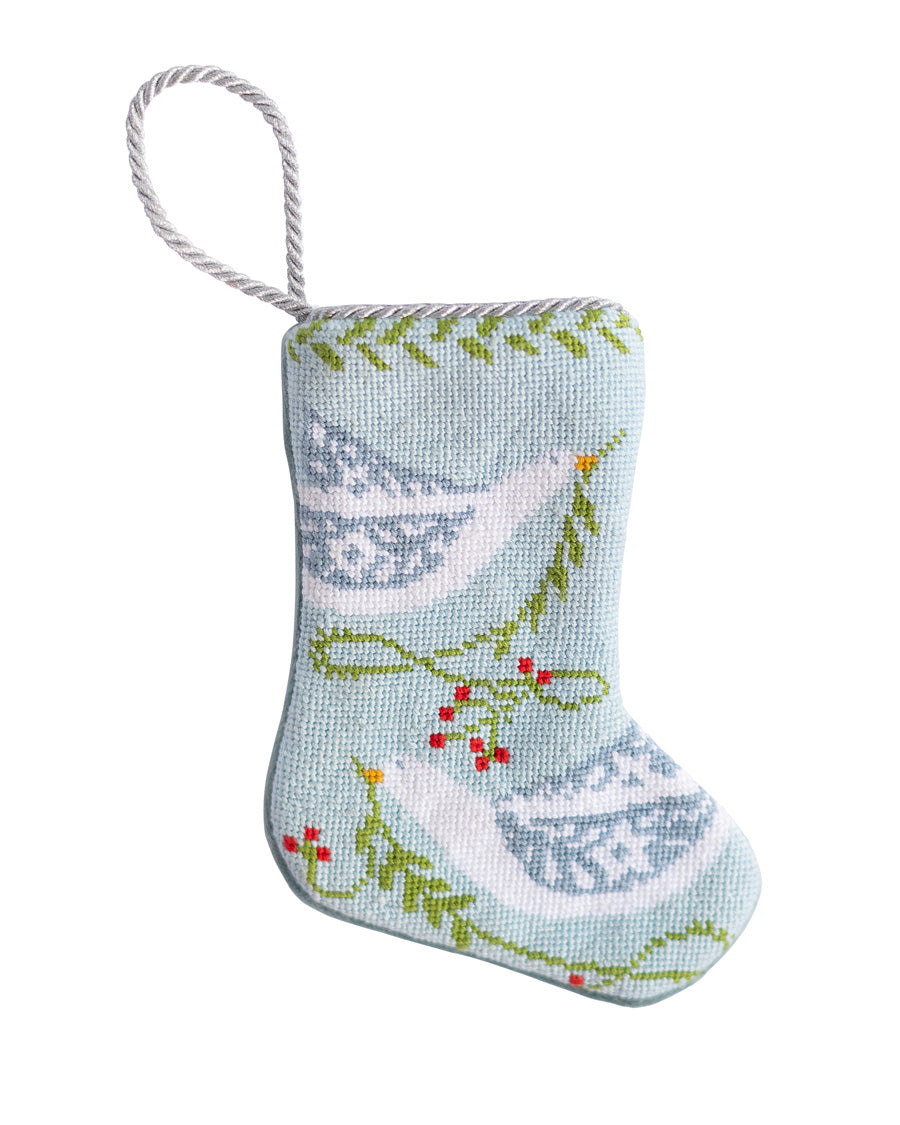 Each heirloom quality Bauble Stocking is hand-stitched needlepoint with cotton threads and oh-so-soft velvet backing. From start to finish, the attention to precise detail makes this a very special gift. 6" long, 4.25" wide